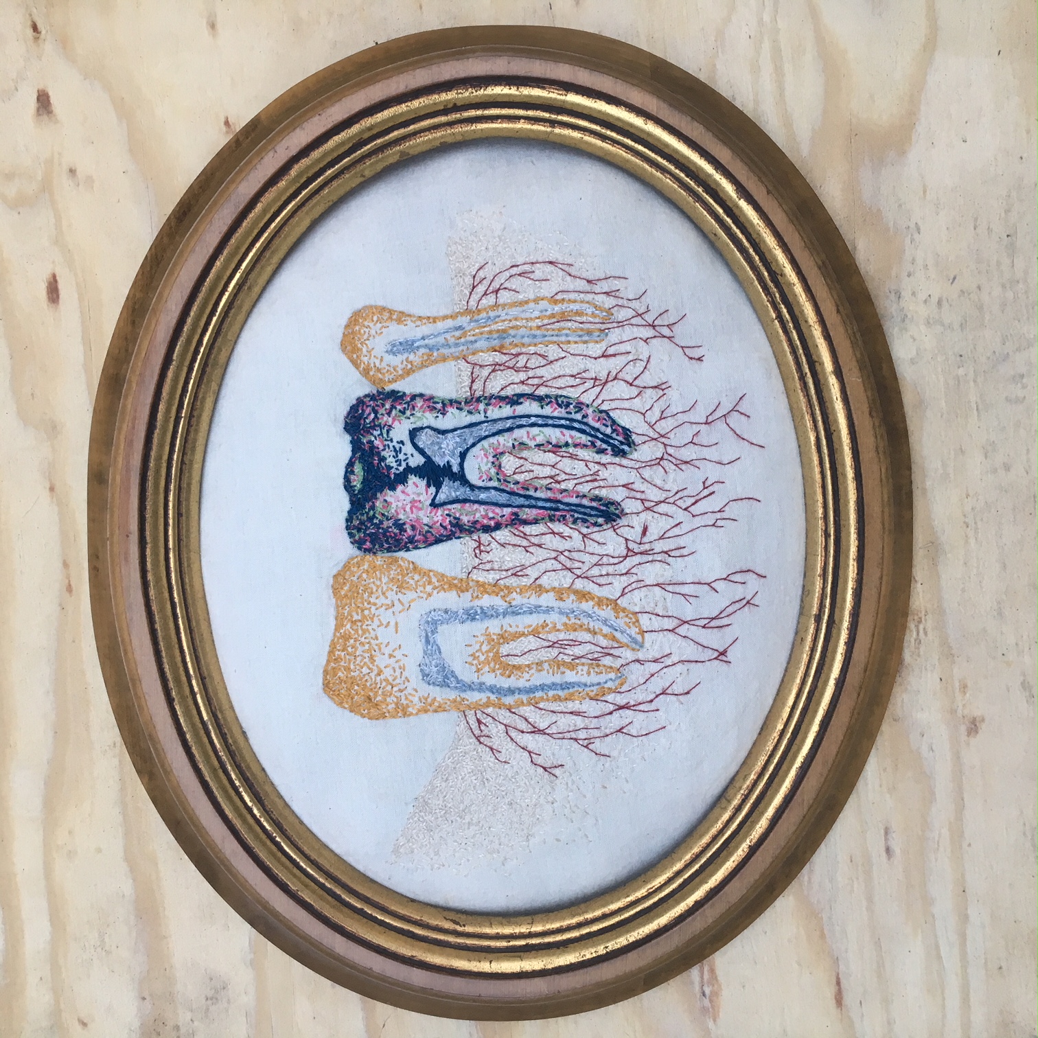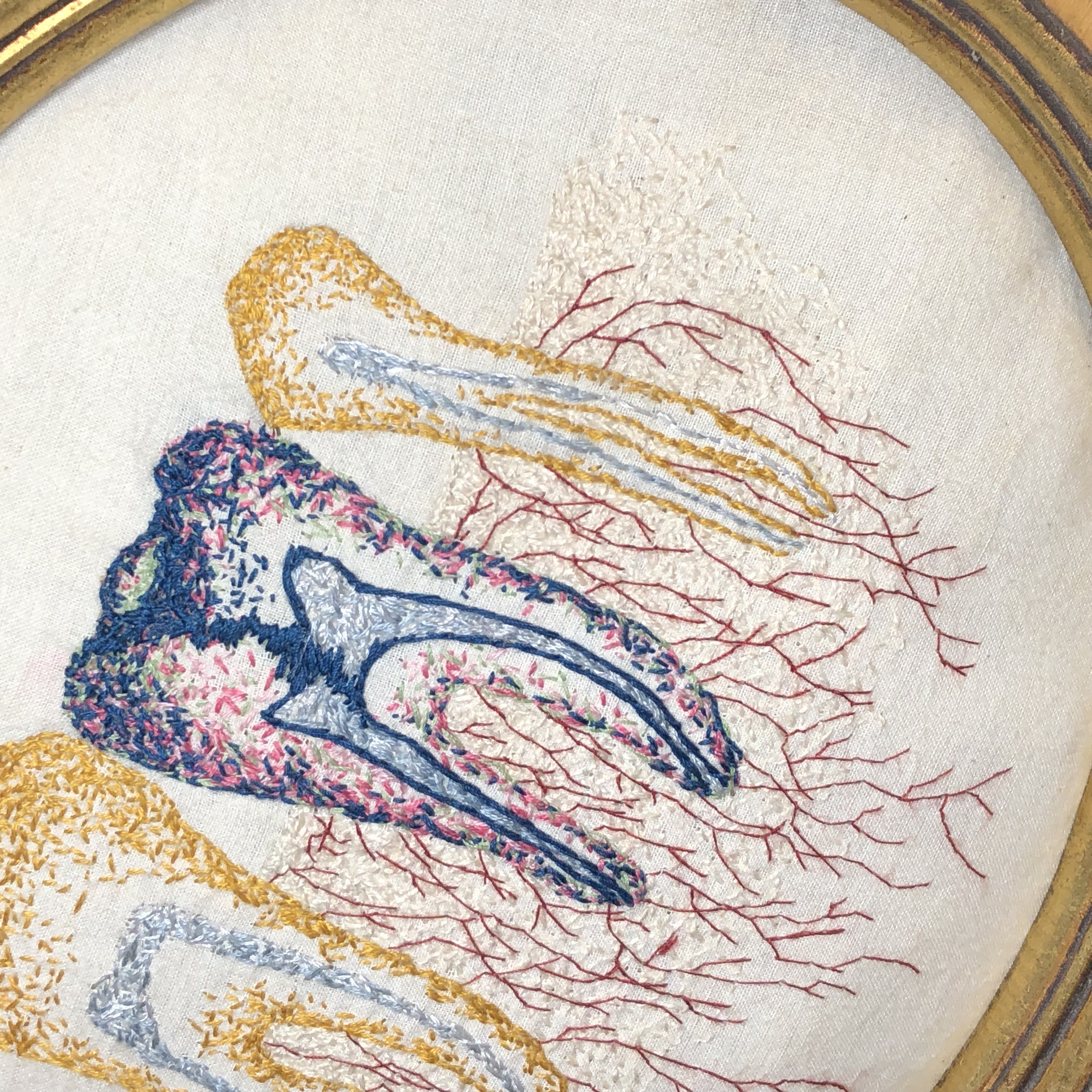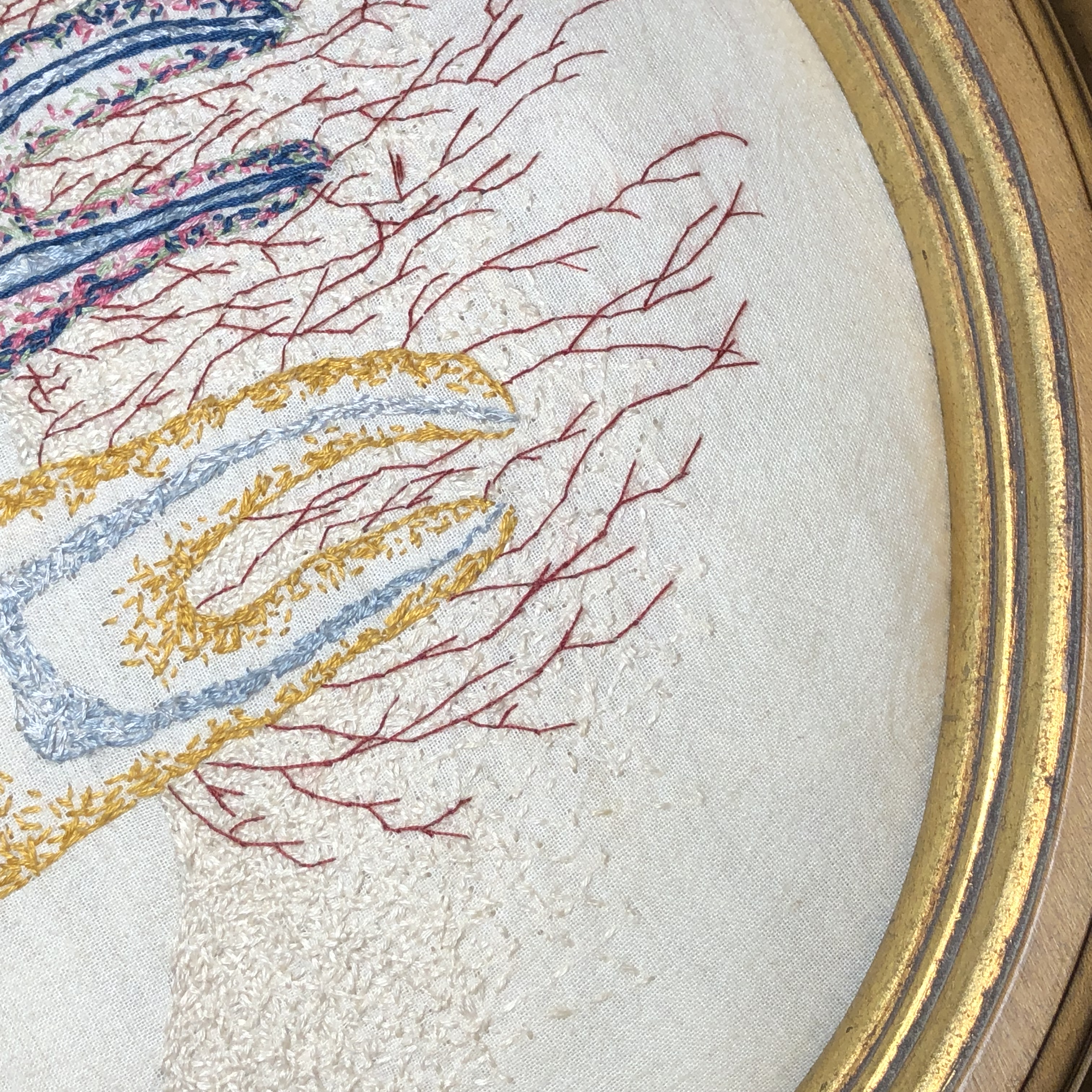 Hand embroidery on muslin with cotton and silk threads. Padded and framed in an antique wooden oval gilded frame. Signed and dated with picture hanger attached.