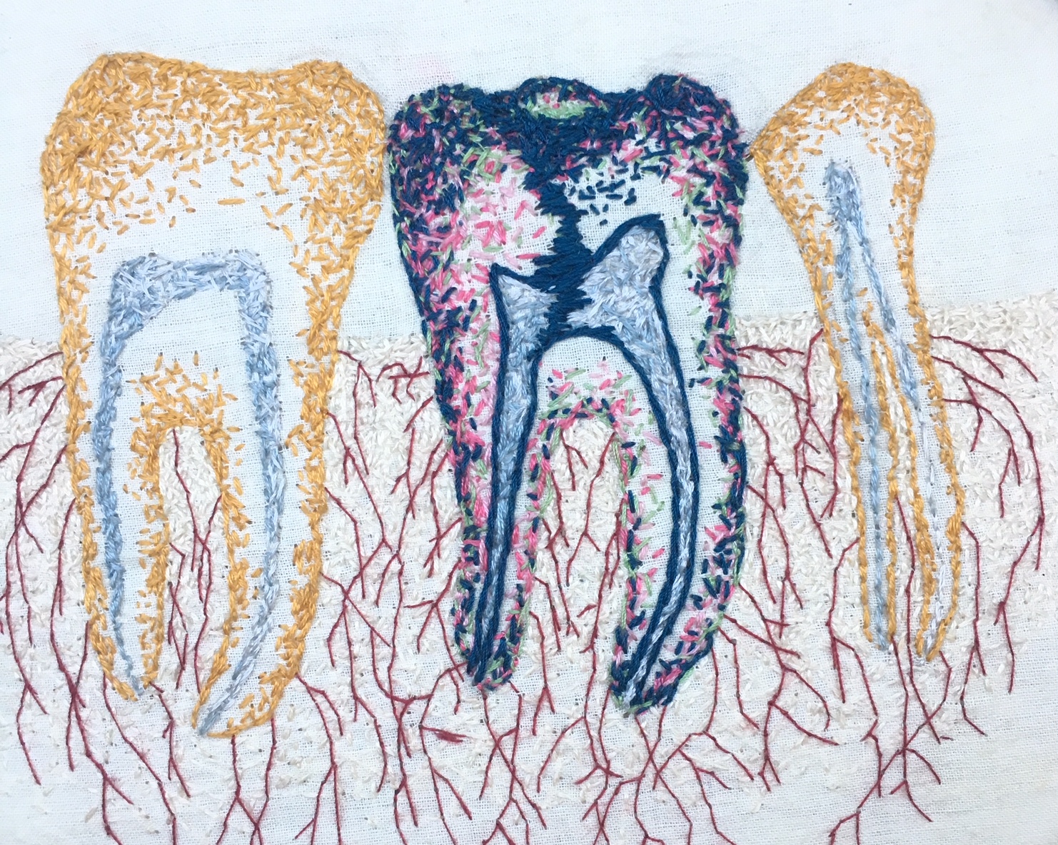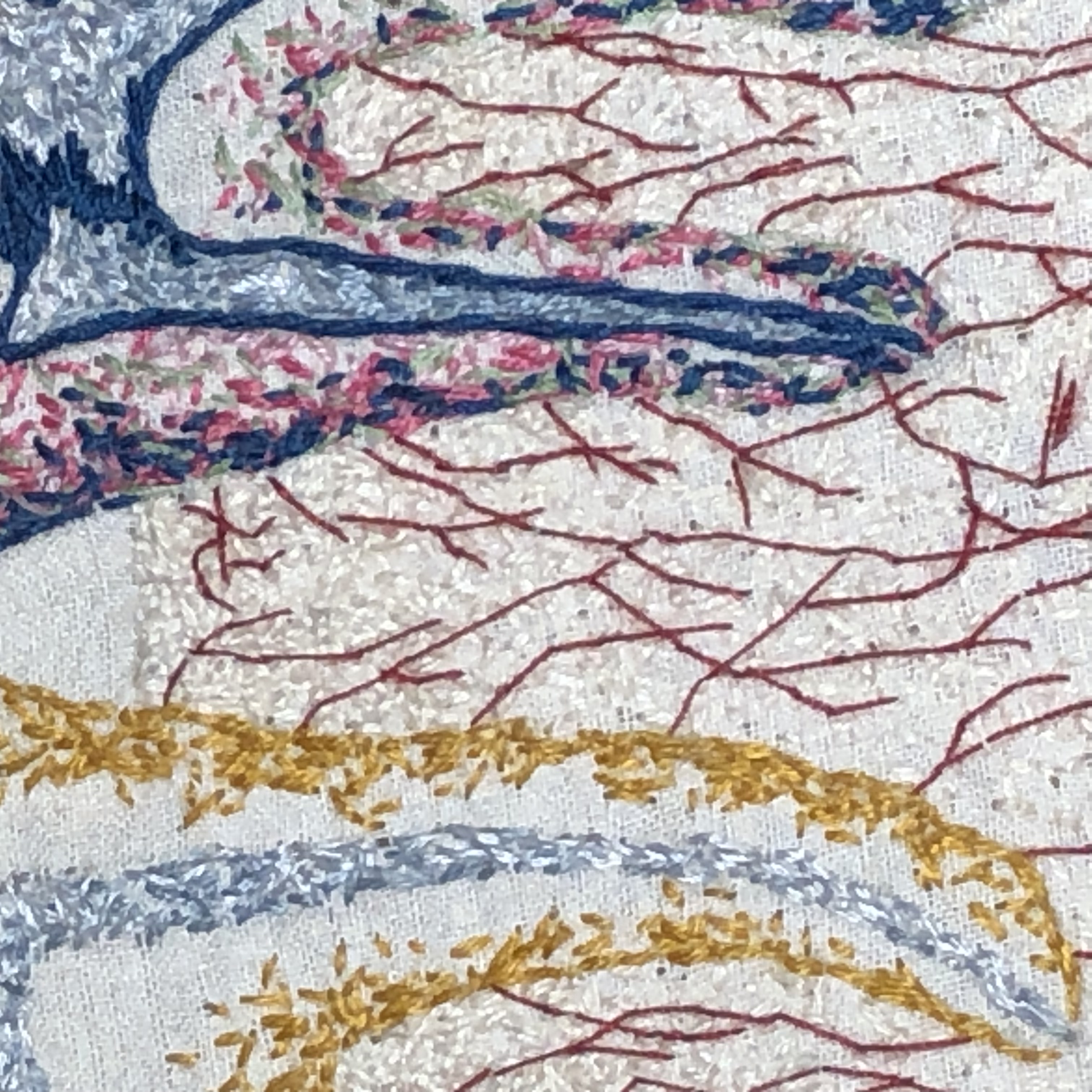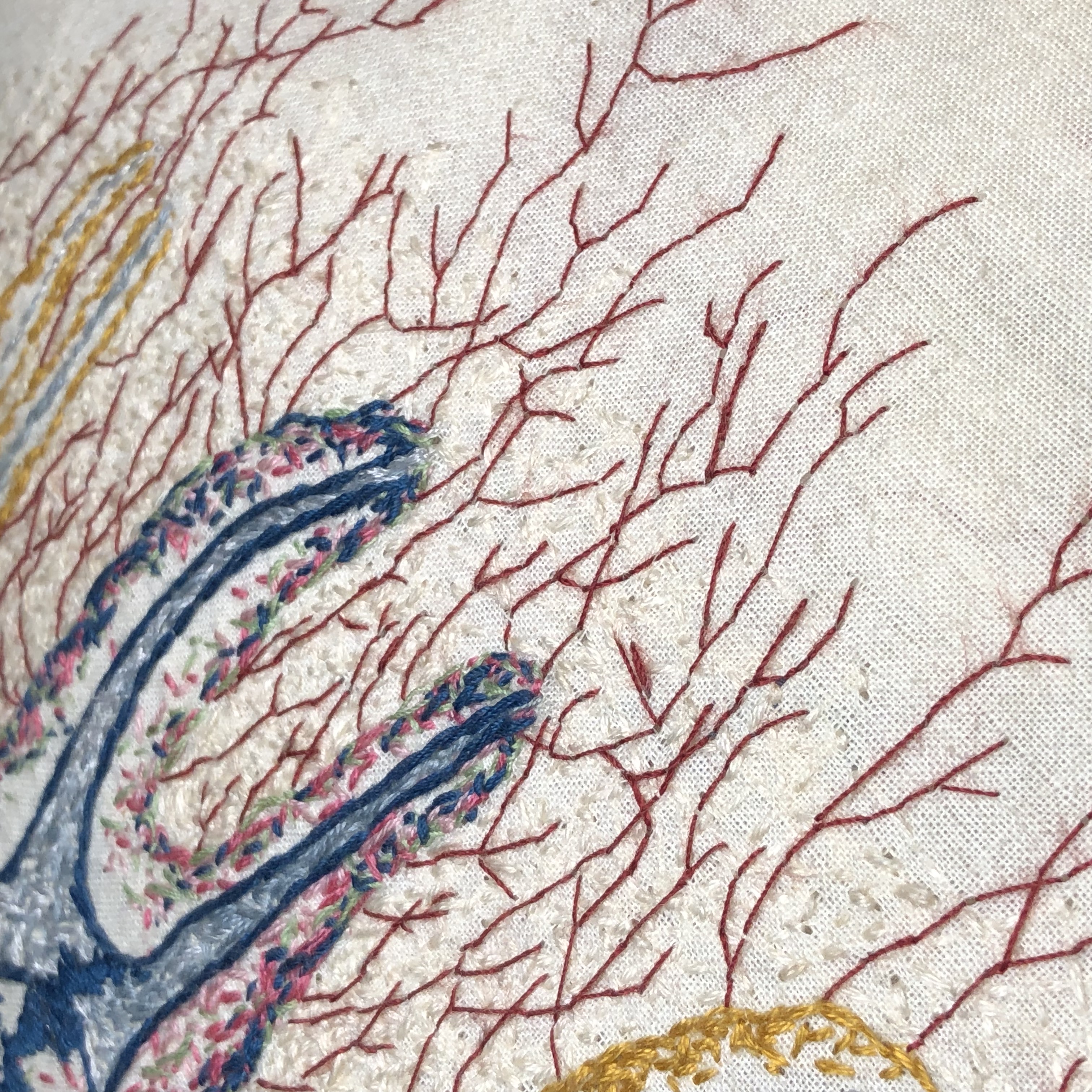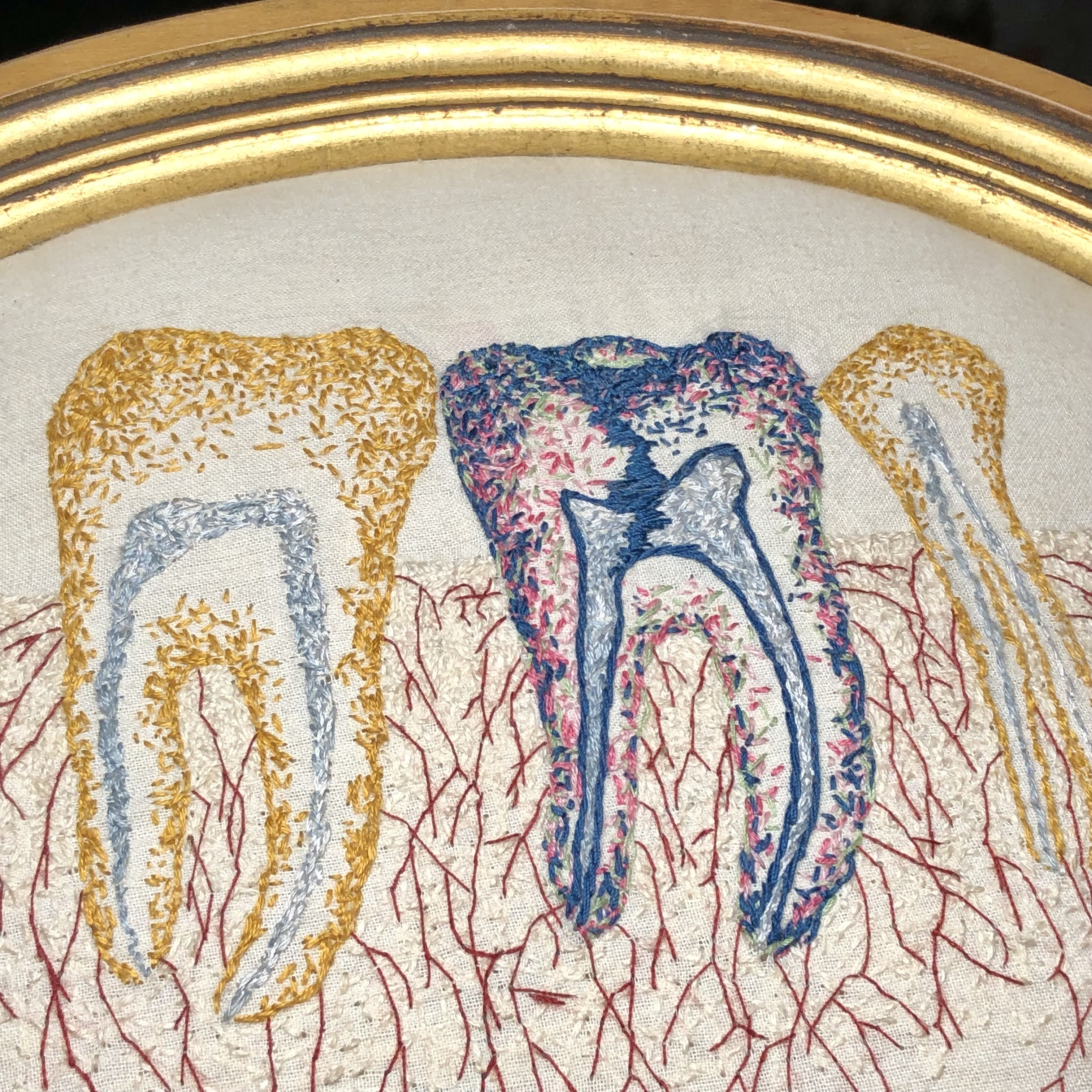 Hand embroidery on muslin with cotton and silk threads. Padded and framed in an antique wooden oval gilded frame. Signed and dated with picture hanger attached.