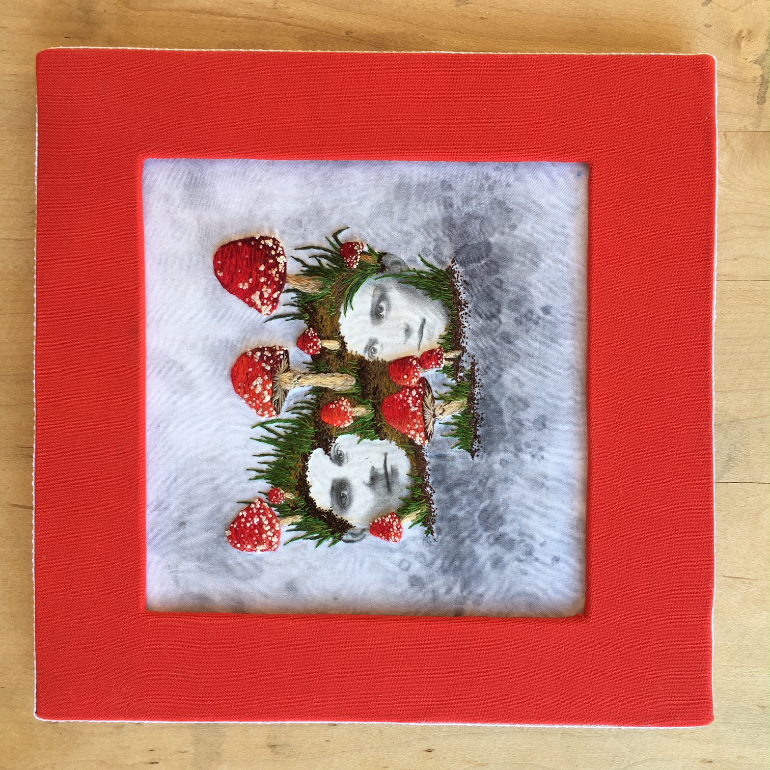 Hand embroidery, photo transfer, and jacquard dyes on cotton. Mounted on board, framed with vintage tomato red fabric and trimmed with heavy vintage lace. Signed and dated with picture hanger attached.