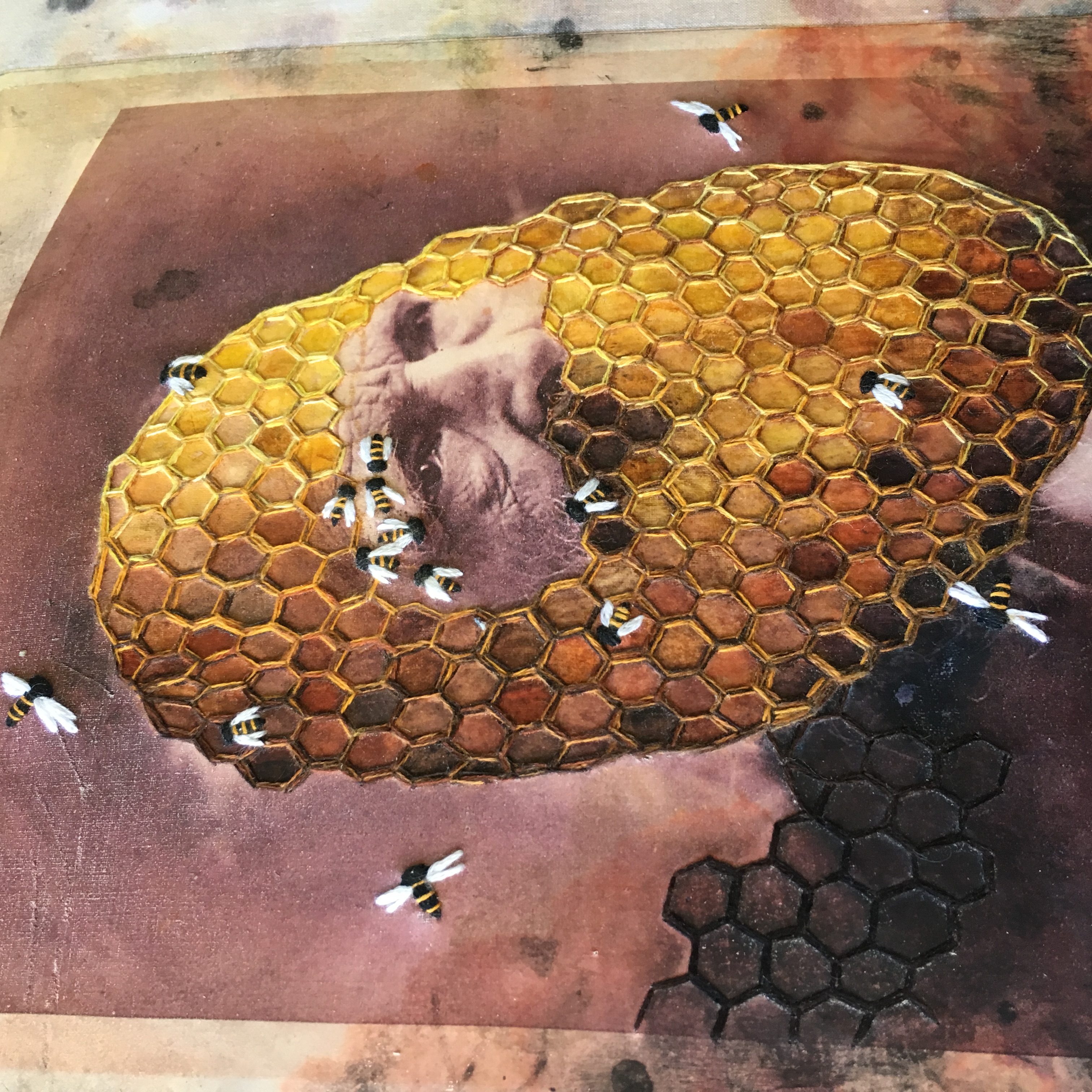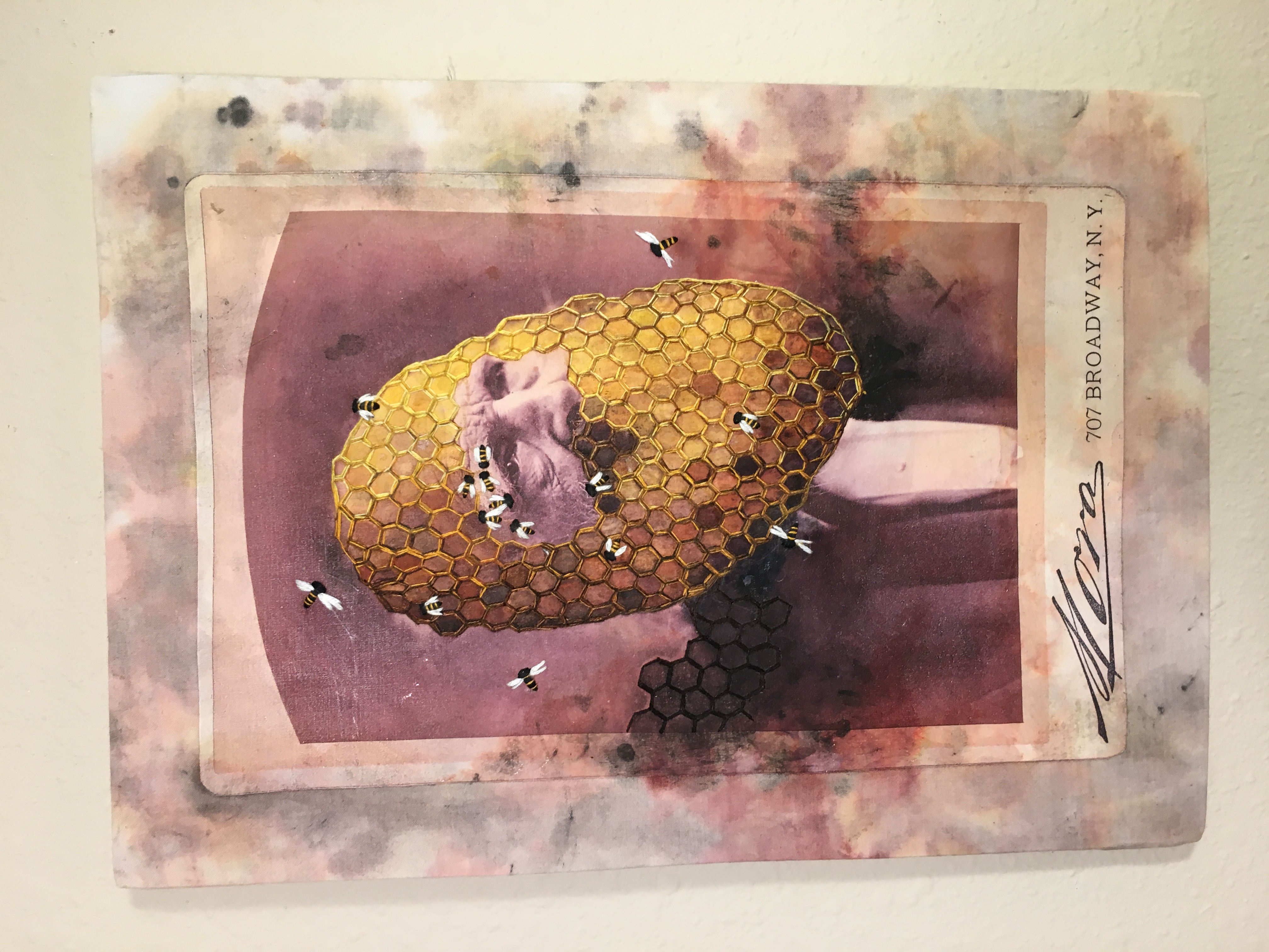 Hand embroidery and photo transfer on cotton, dyed with acid dyes. Mounted on board, signed and dated with picture hanger attached. 9" x 12" live area 6.5" x 10.5"