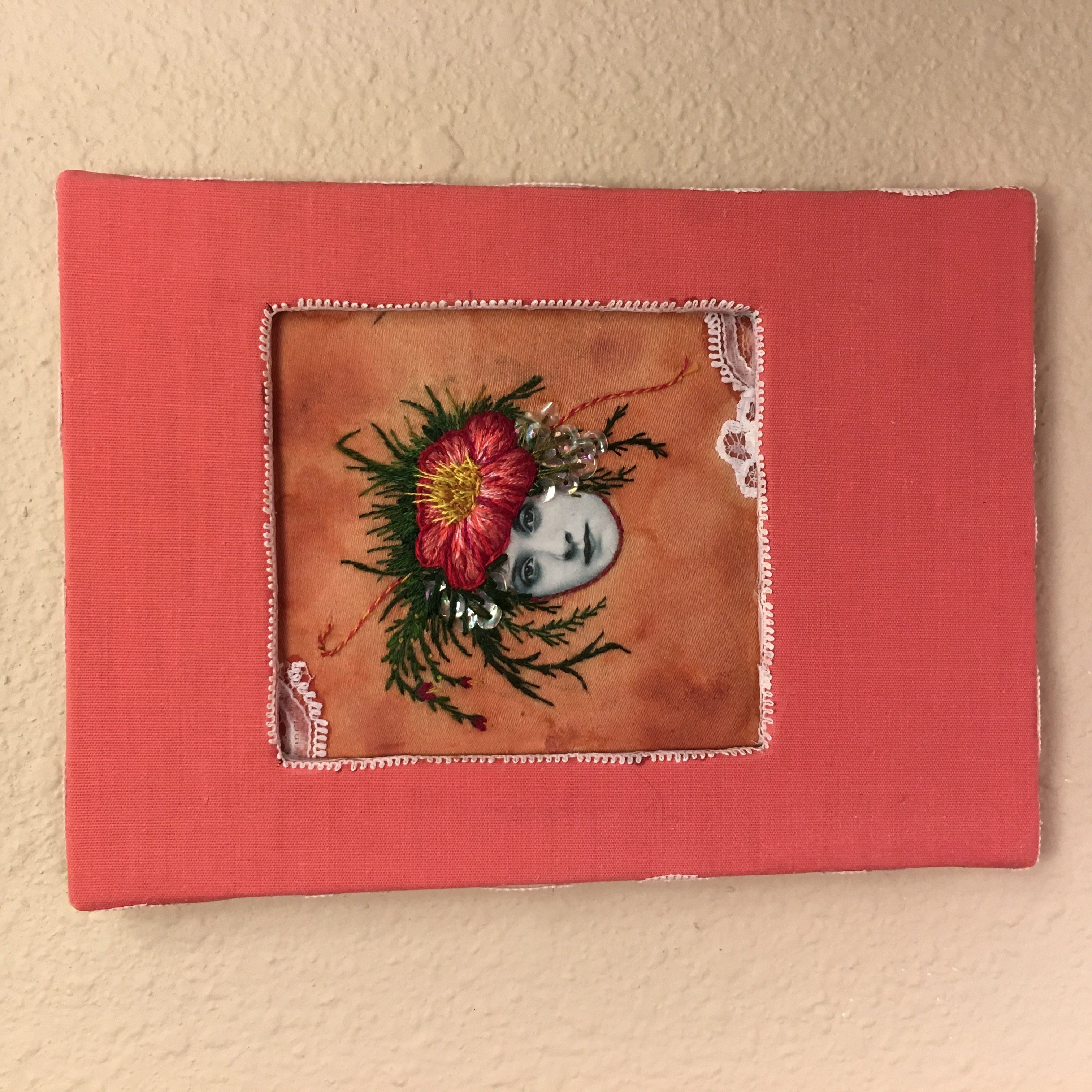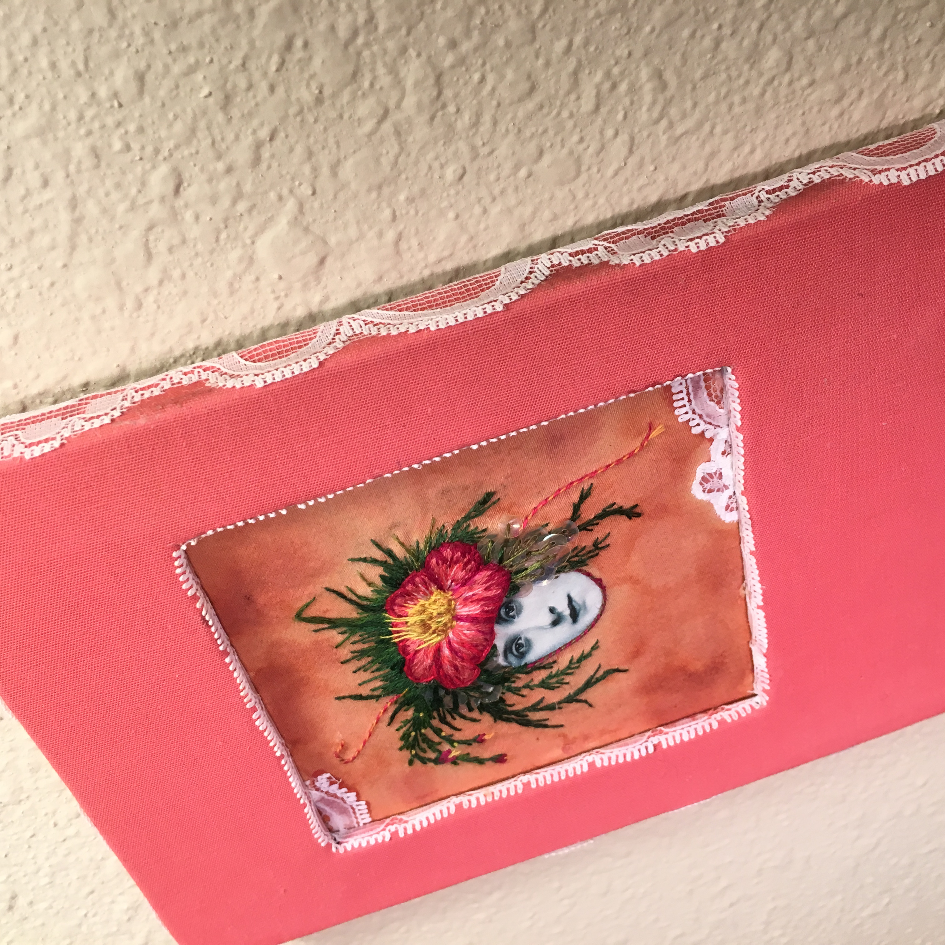 Hand embroidery, acid dyes, and photo transfer on cotton. Mounted on board and framed with pink cotton trimmed with vintage lace. Signed and dated with picture hanger attached. 5" x 7", live area 3.5”, 1/4" deep