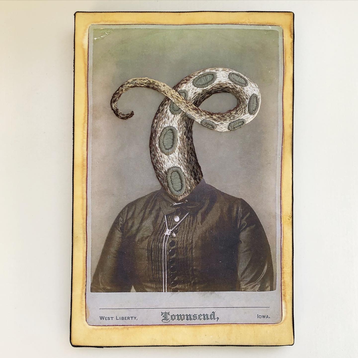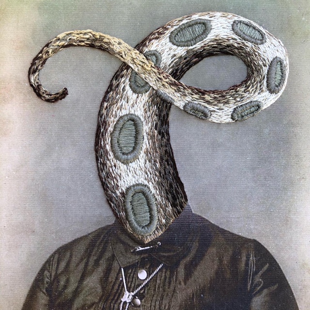 Hand embroidery, photo transfer and jacquard dyes on cotton. Mounted on board and trimmed with gilded silver ribbon. Signed and dated with picture hanger attached.