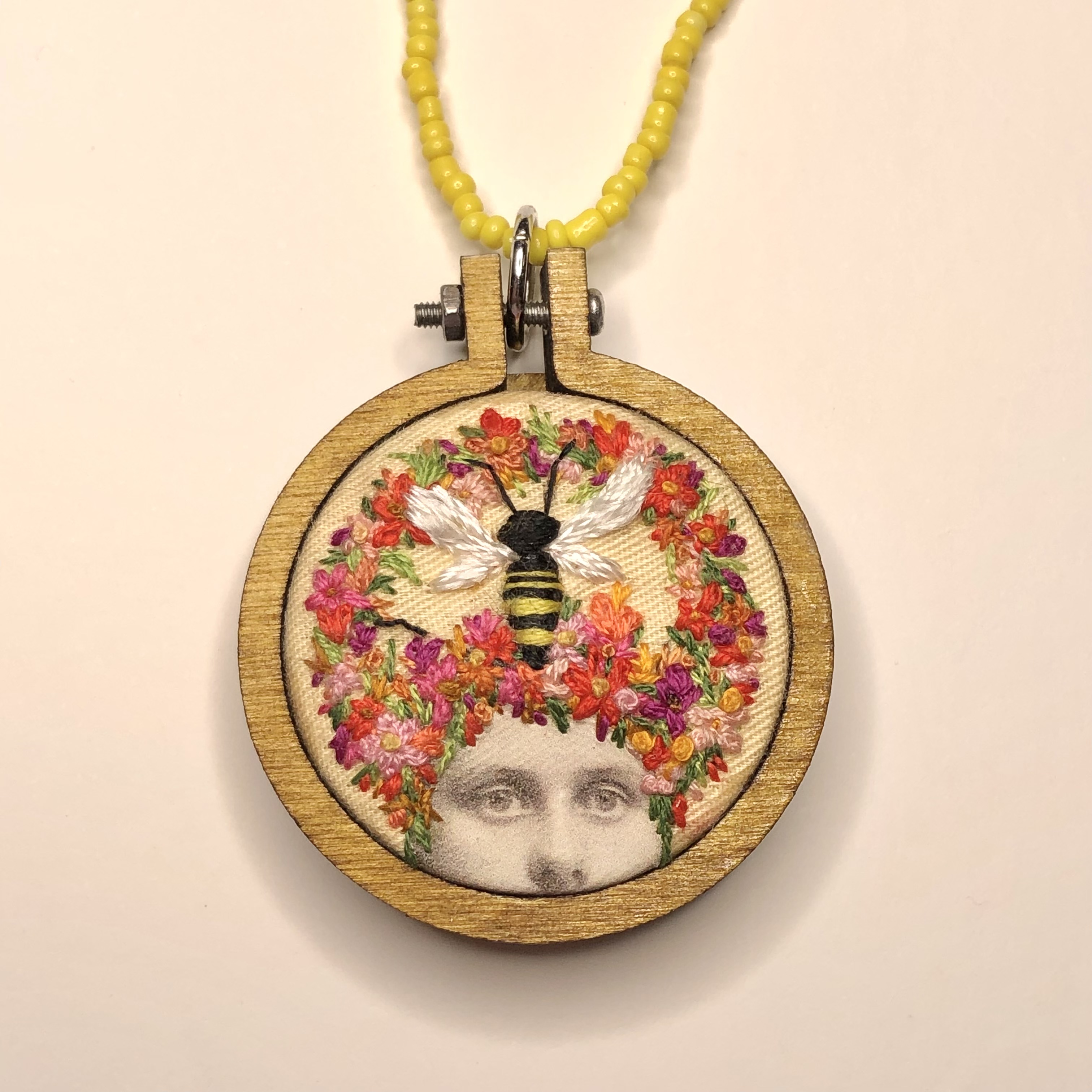 Hand embroidery and photo transfer on cotton, set in a tiny stained wooden embroidery hoop. Hangs from a 16" adjustable beaded necklace and fastens with a lobster claw clasp.