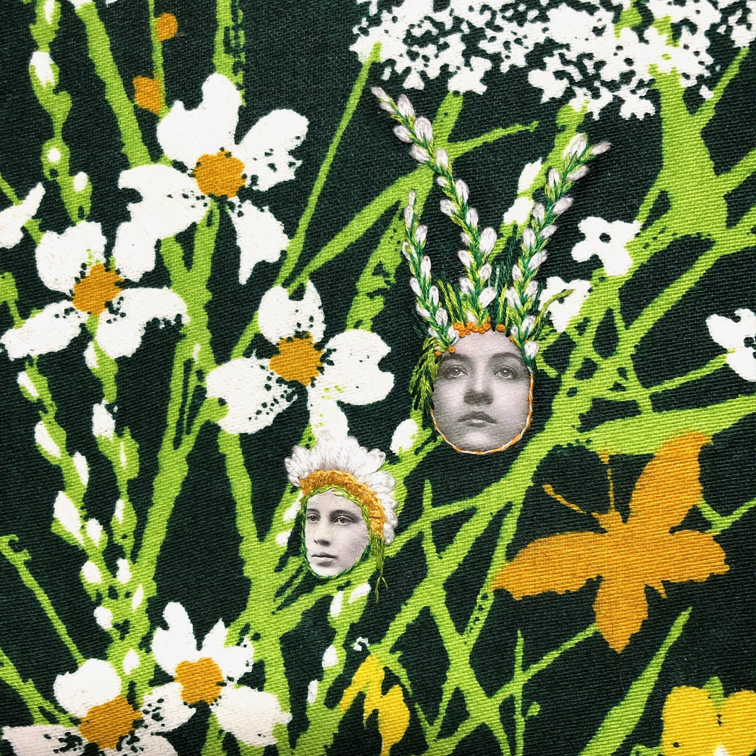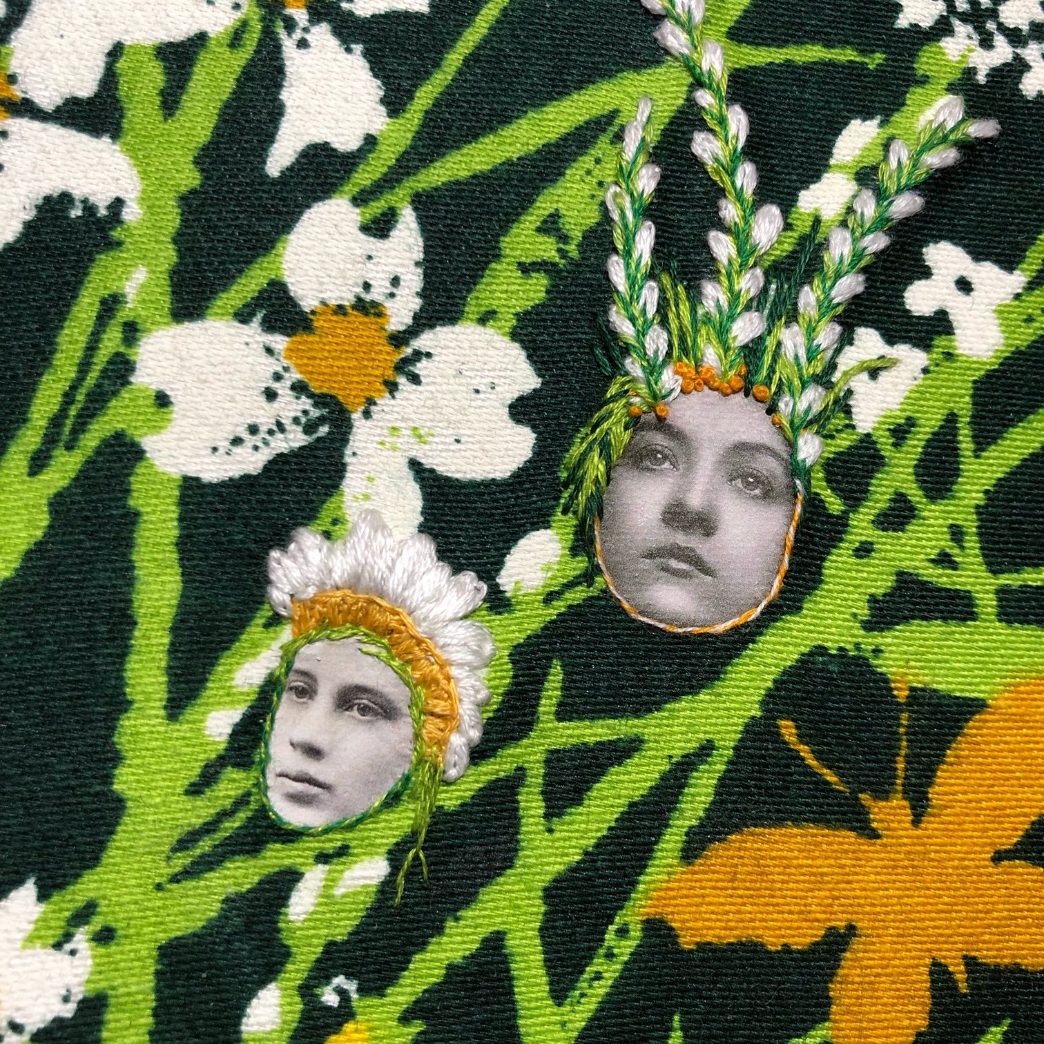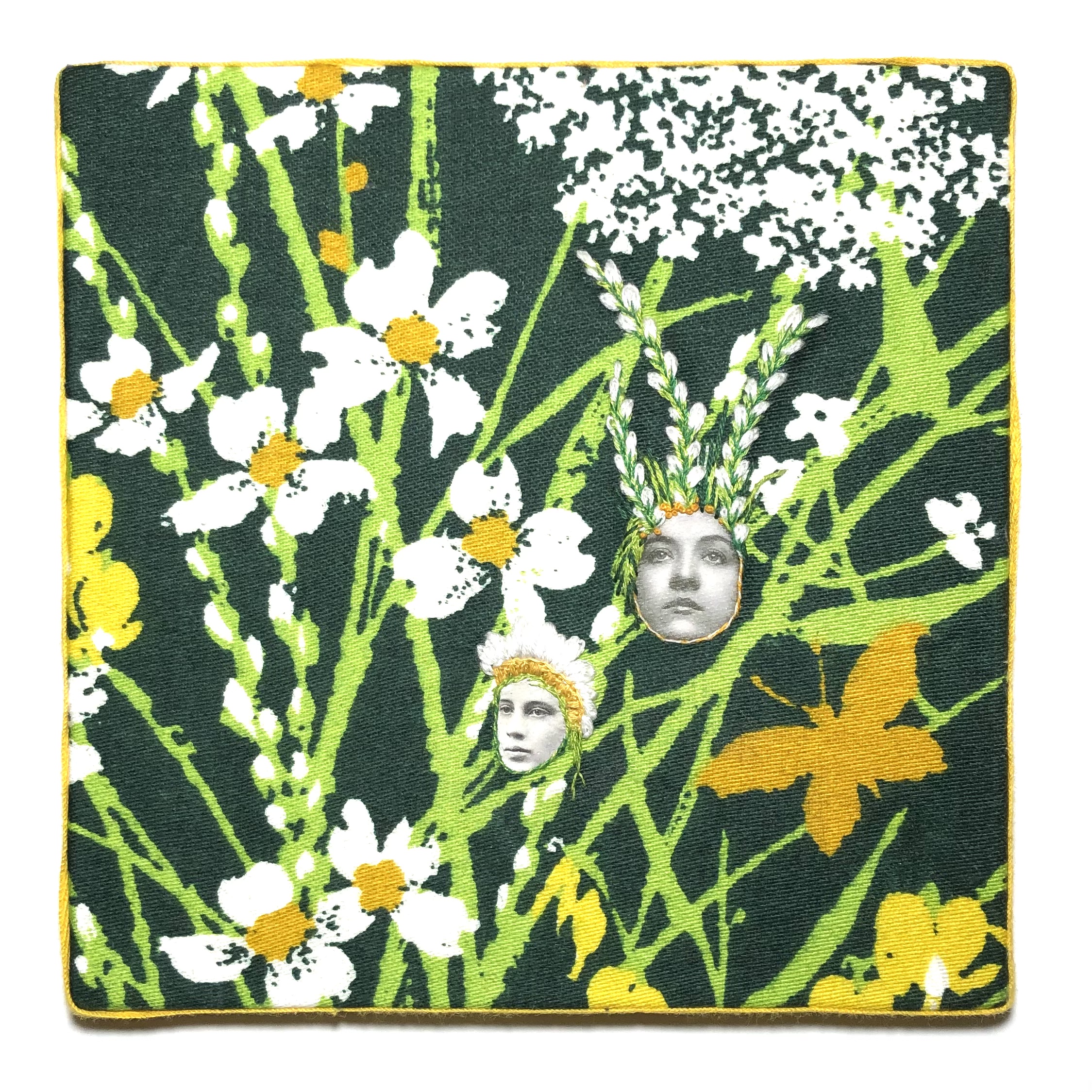Hand embroidery and photo transfer on vintage screen printed cotton. Mounted on board, signed and dated with picture hanger attached. Trimmed with woven herringbone ribbon.