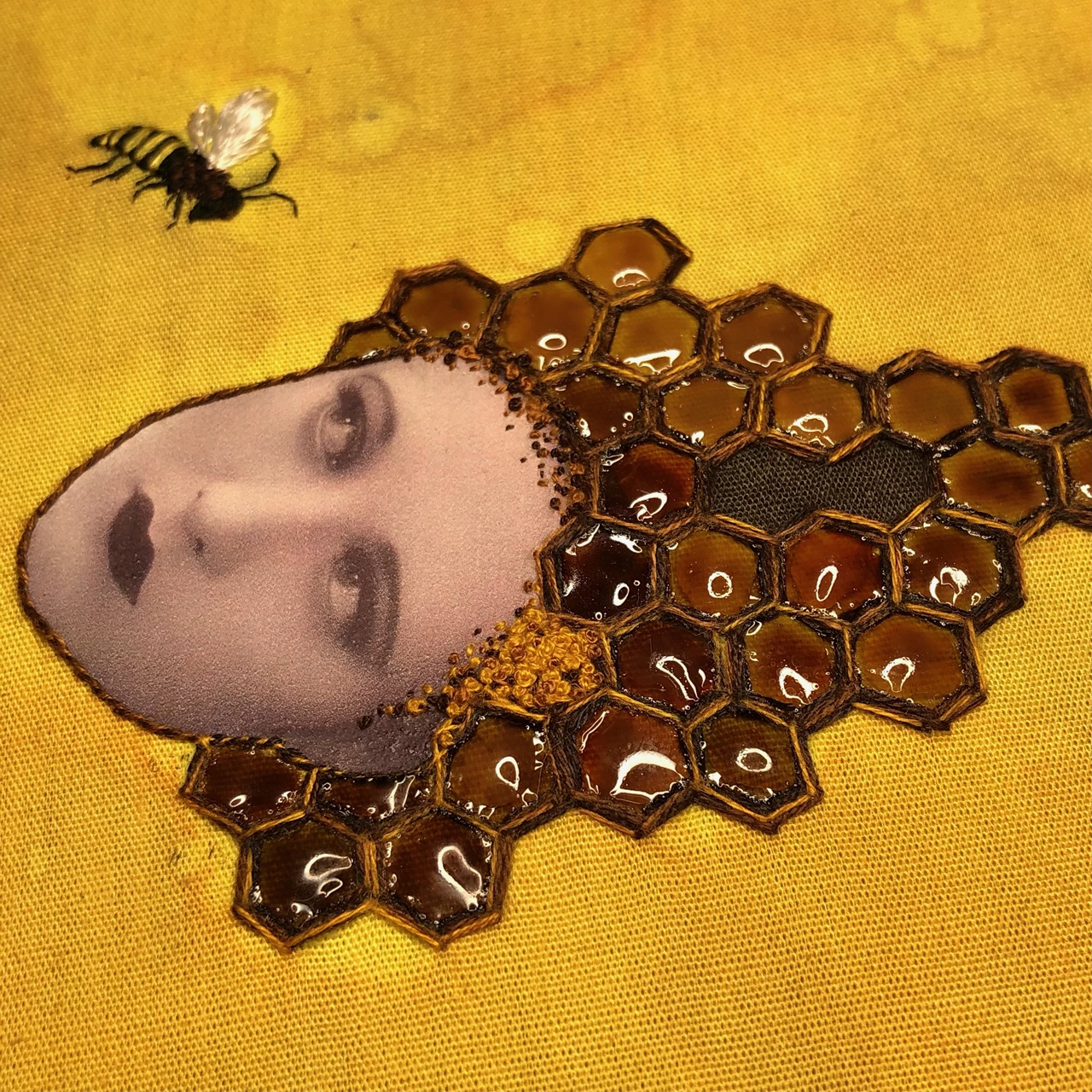 Hand embroidery and photo transfer on cotton, accented with acrylic resin. Mounted on board and trimmed with velvet, signed and dated with picture hanger attached.