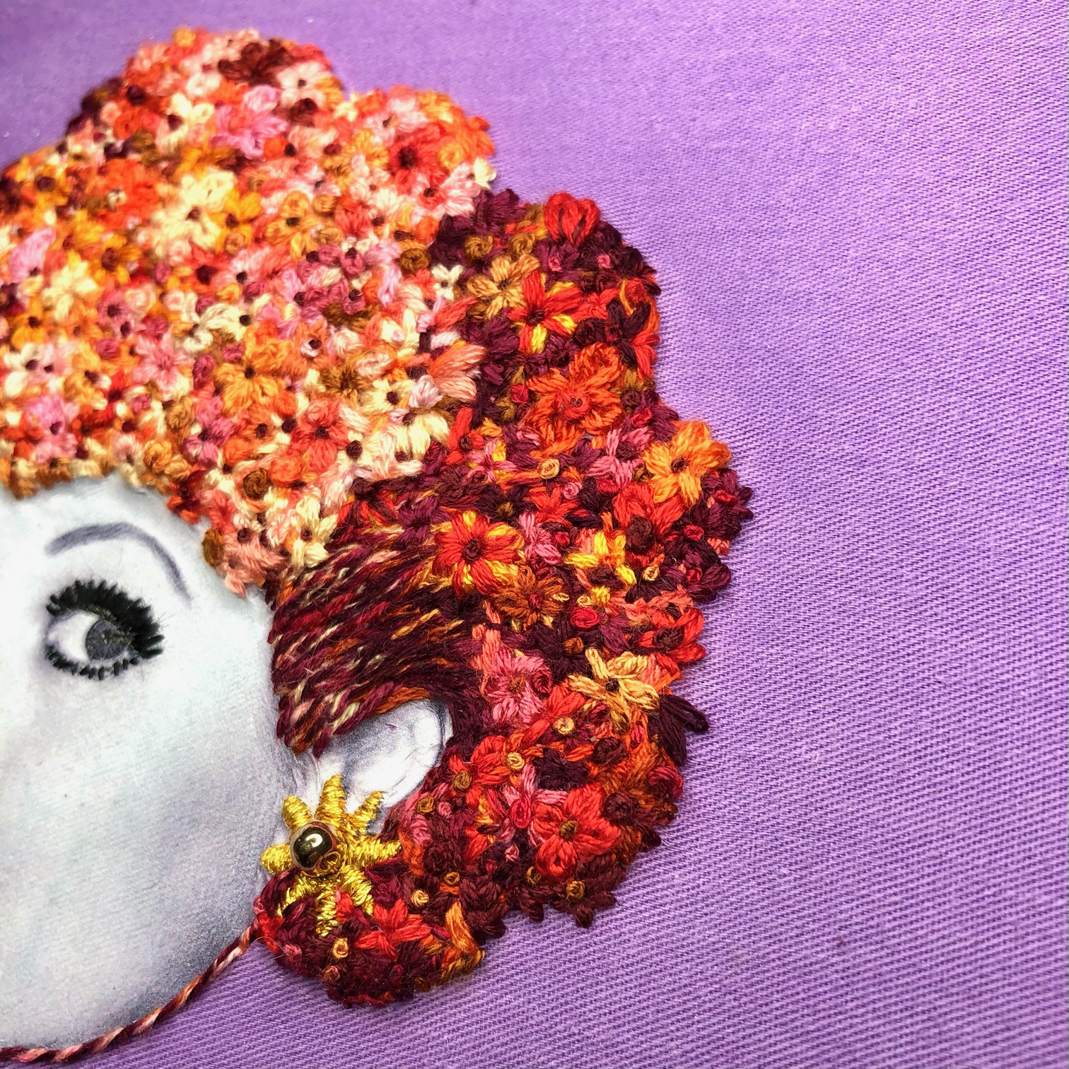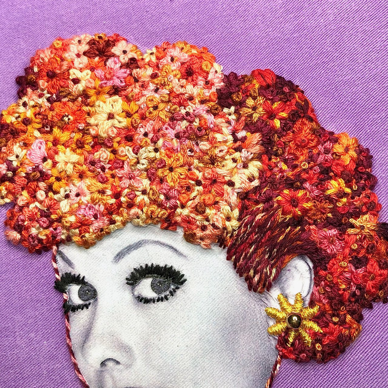 Hand embroidery and photo transfer on cotton. Accented with gold gilded thread and a vintage gold costume bead, framed with orange cotton fabric and trimmed with velvet ribbon. Signed and dated with picture hanger attached.