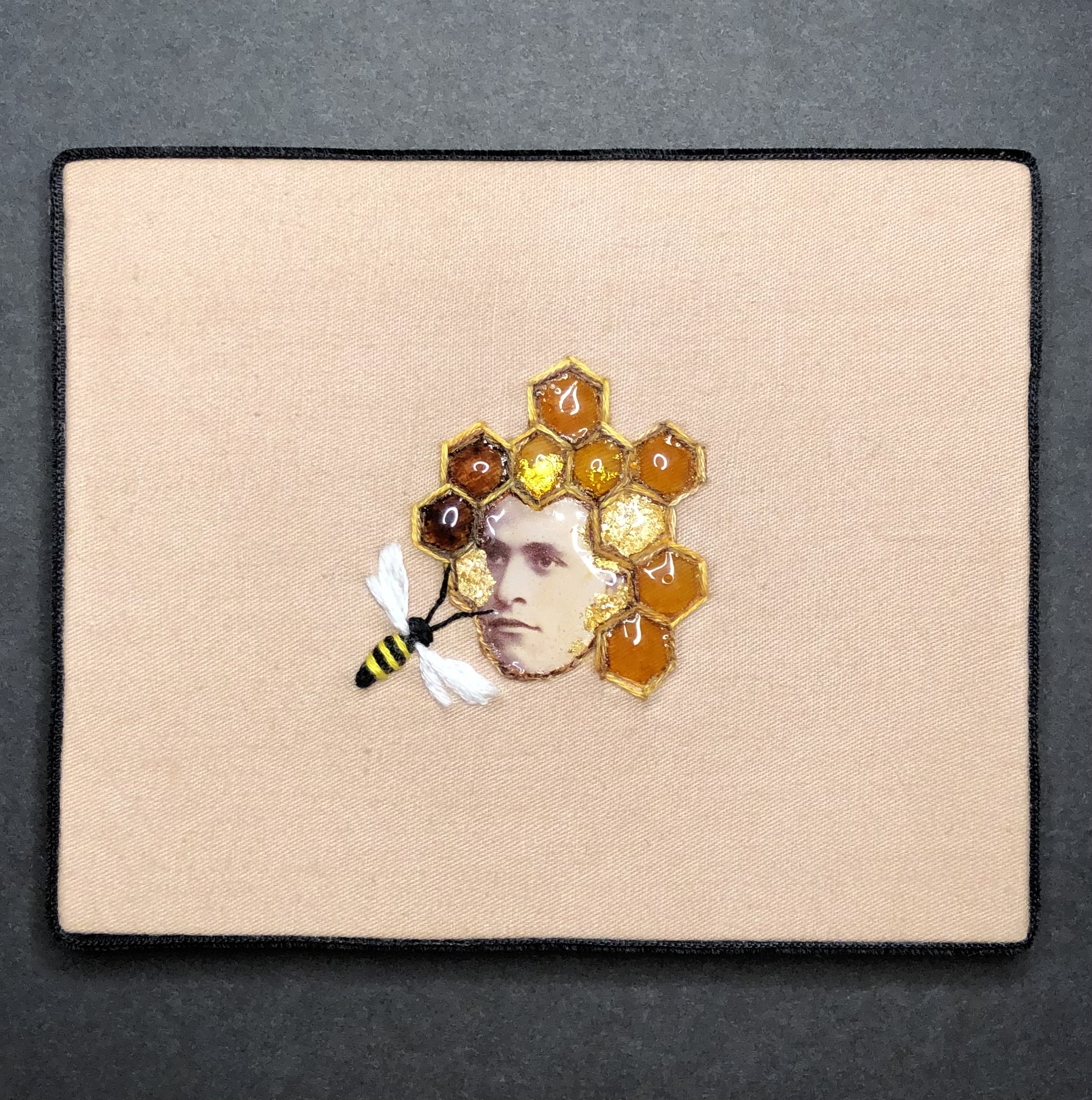 Hand embroidery and photo transfer on cotton, accented with gold leaf and acrylic resin. Mounted on board and trimmed with velvet, signed and dated with picture hanger attached.