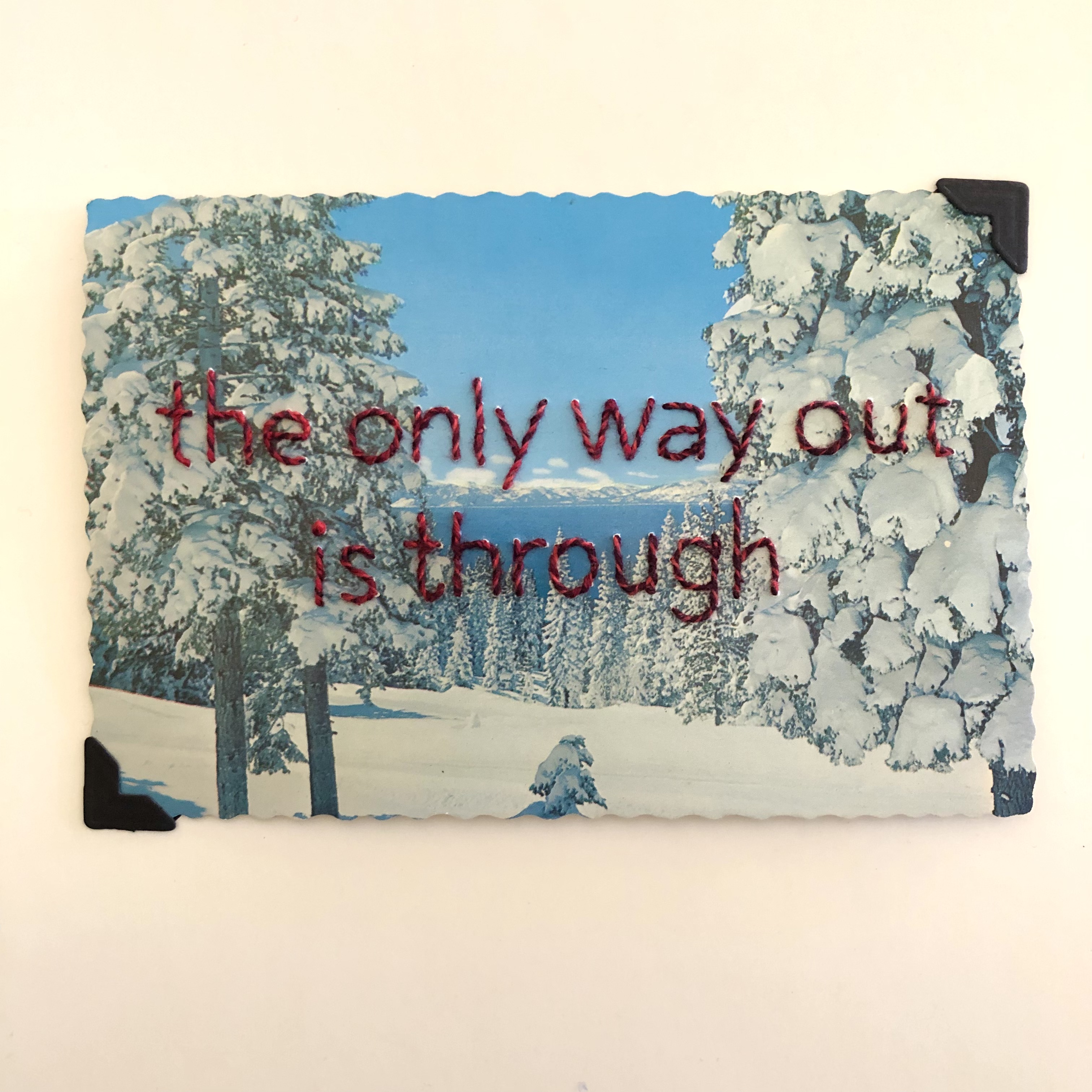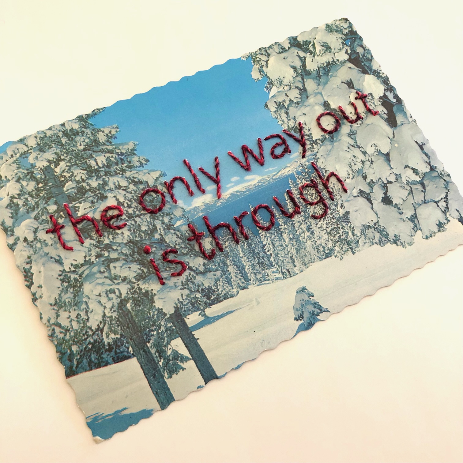 Hand embroidery on a vintage glossy postcard. Photo corners included for easy display or framing.