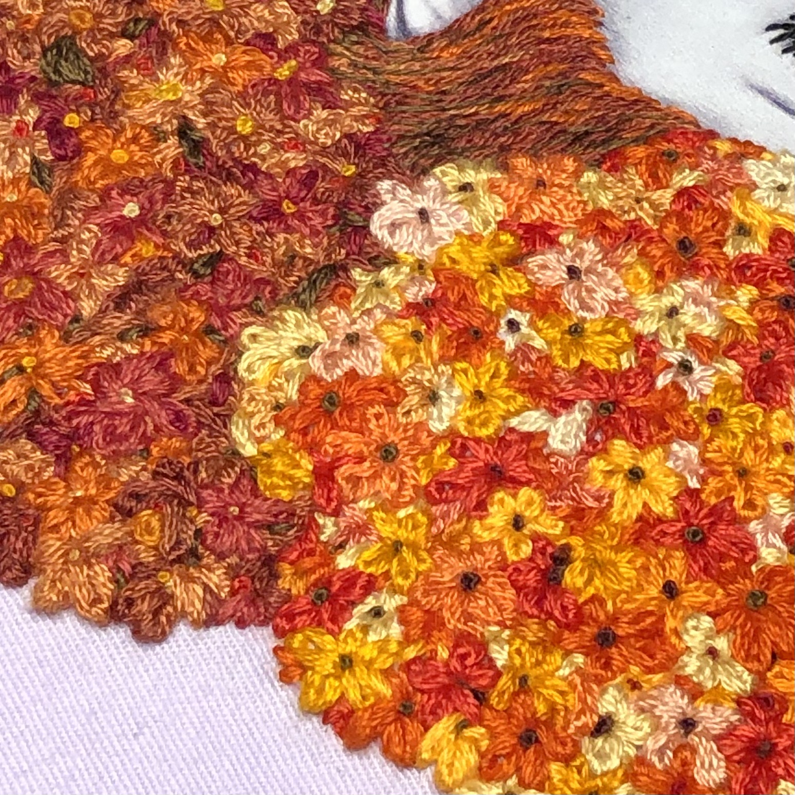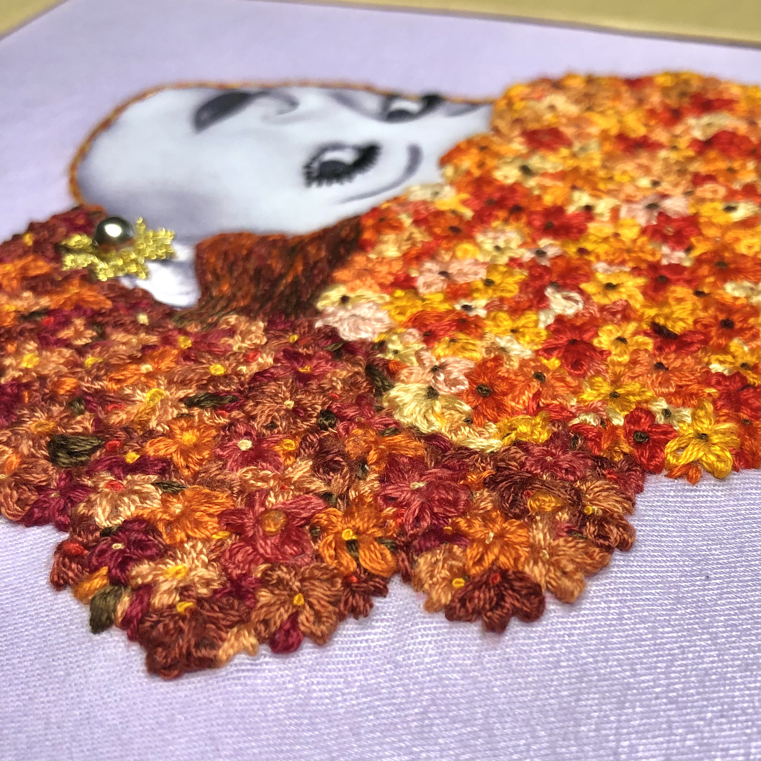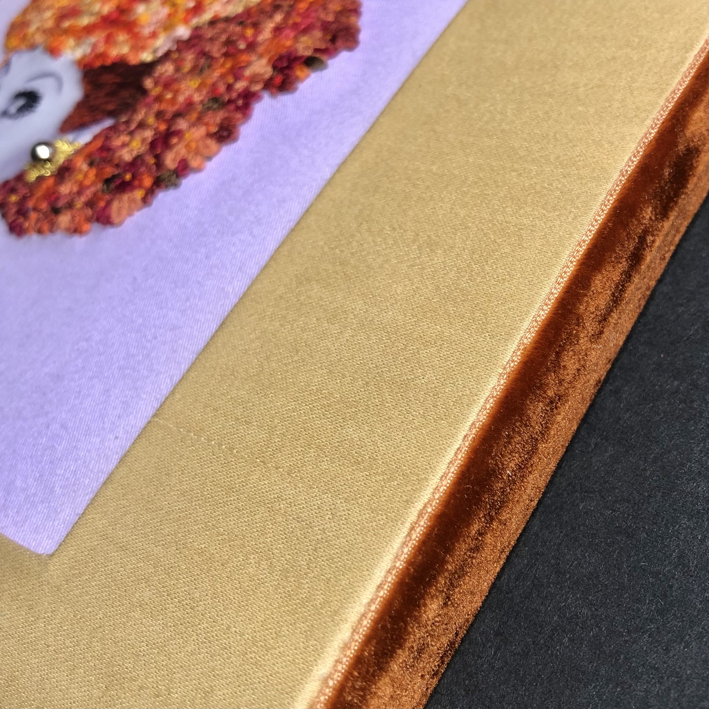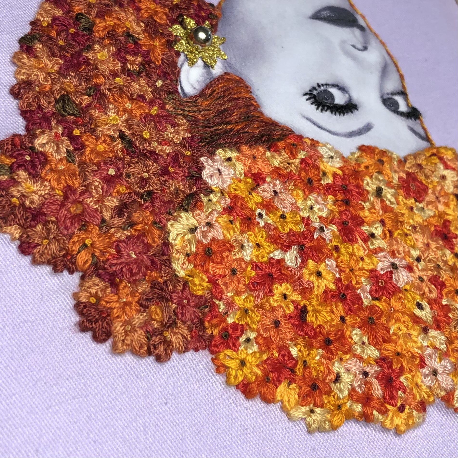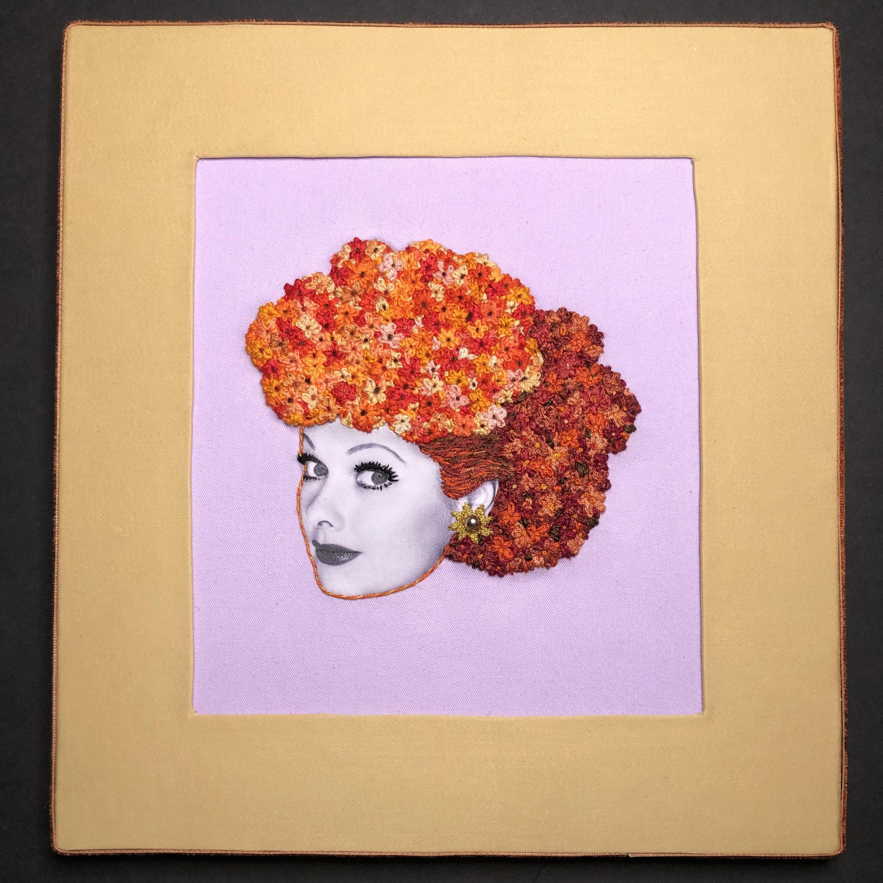 Hand embroidery and photo transfer on cotton. Accented with gold gilded thread and a vintage gold costume bead, framed with vintage cotton fabric and trimmed with velvet ribbon. Signed and dated with picture hanger attached.