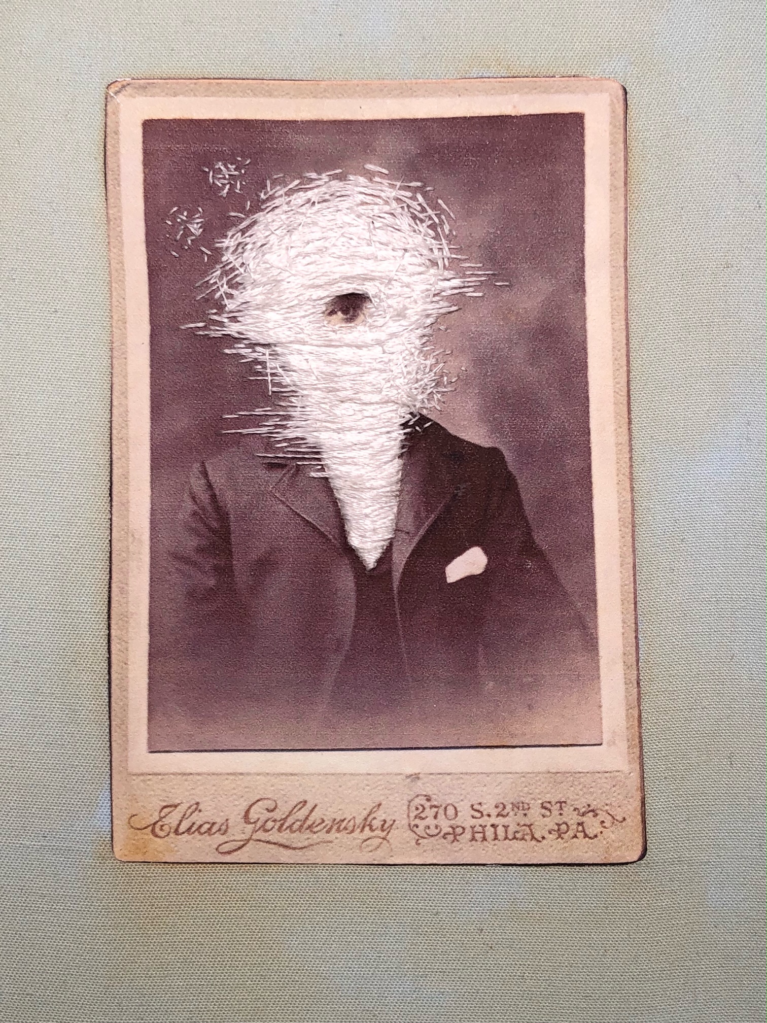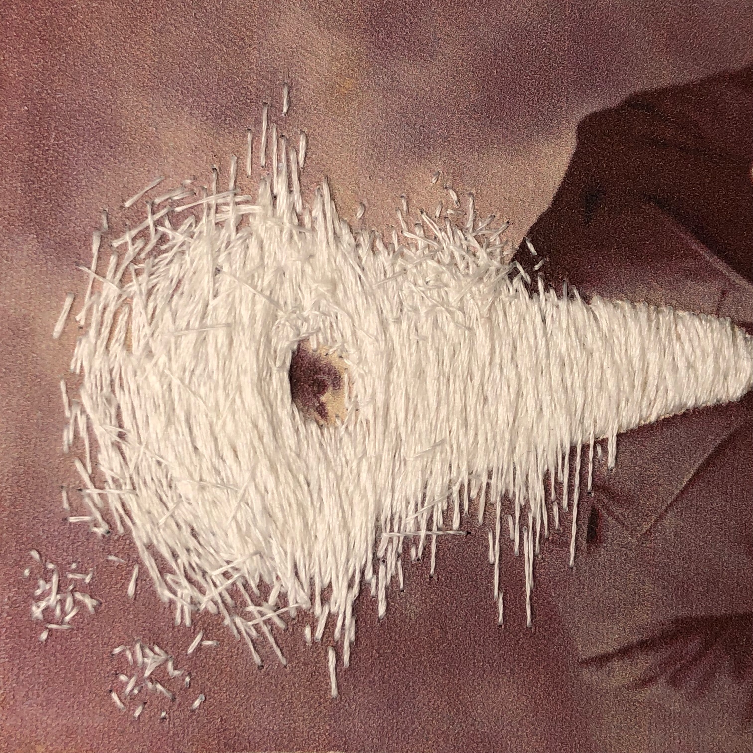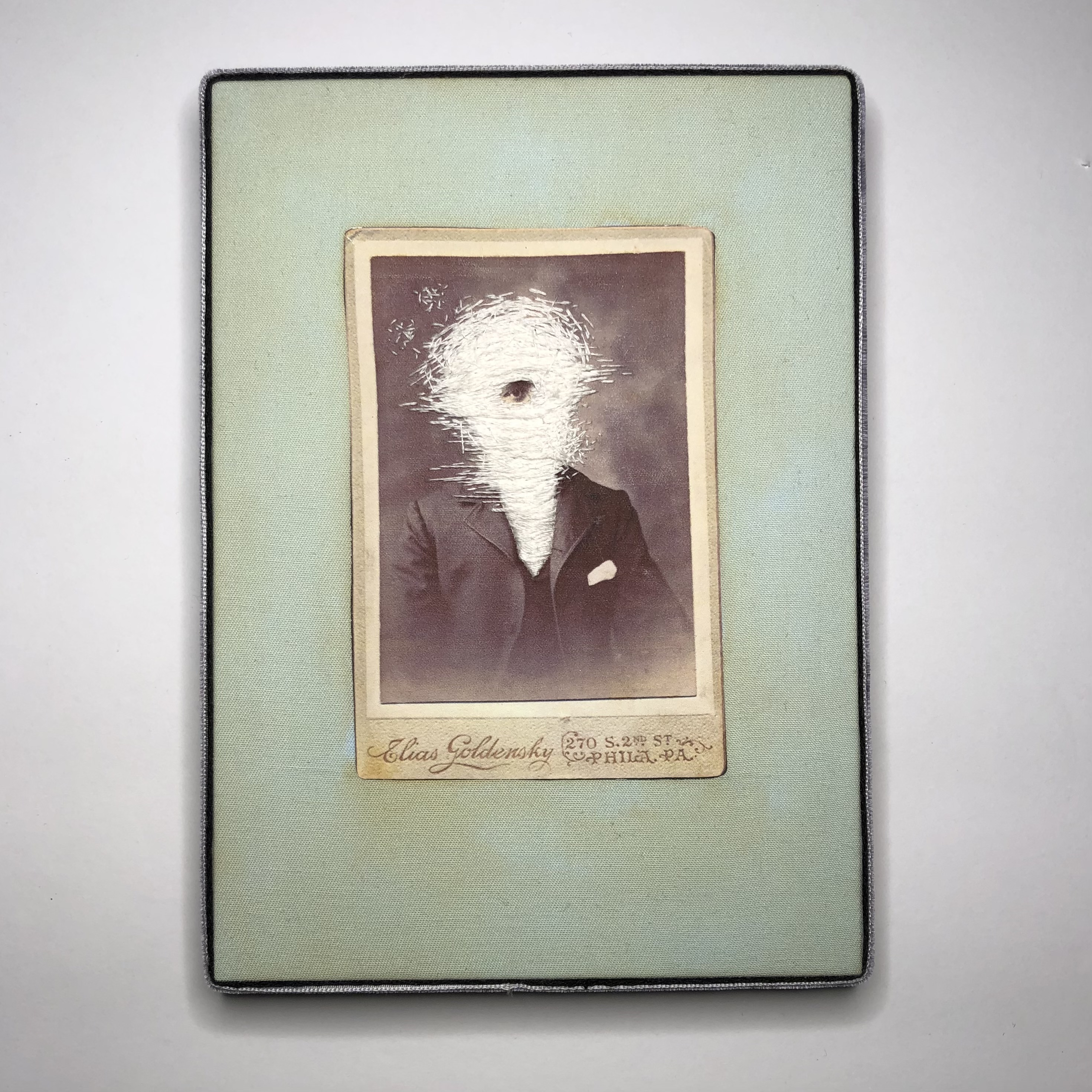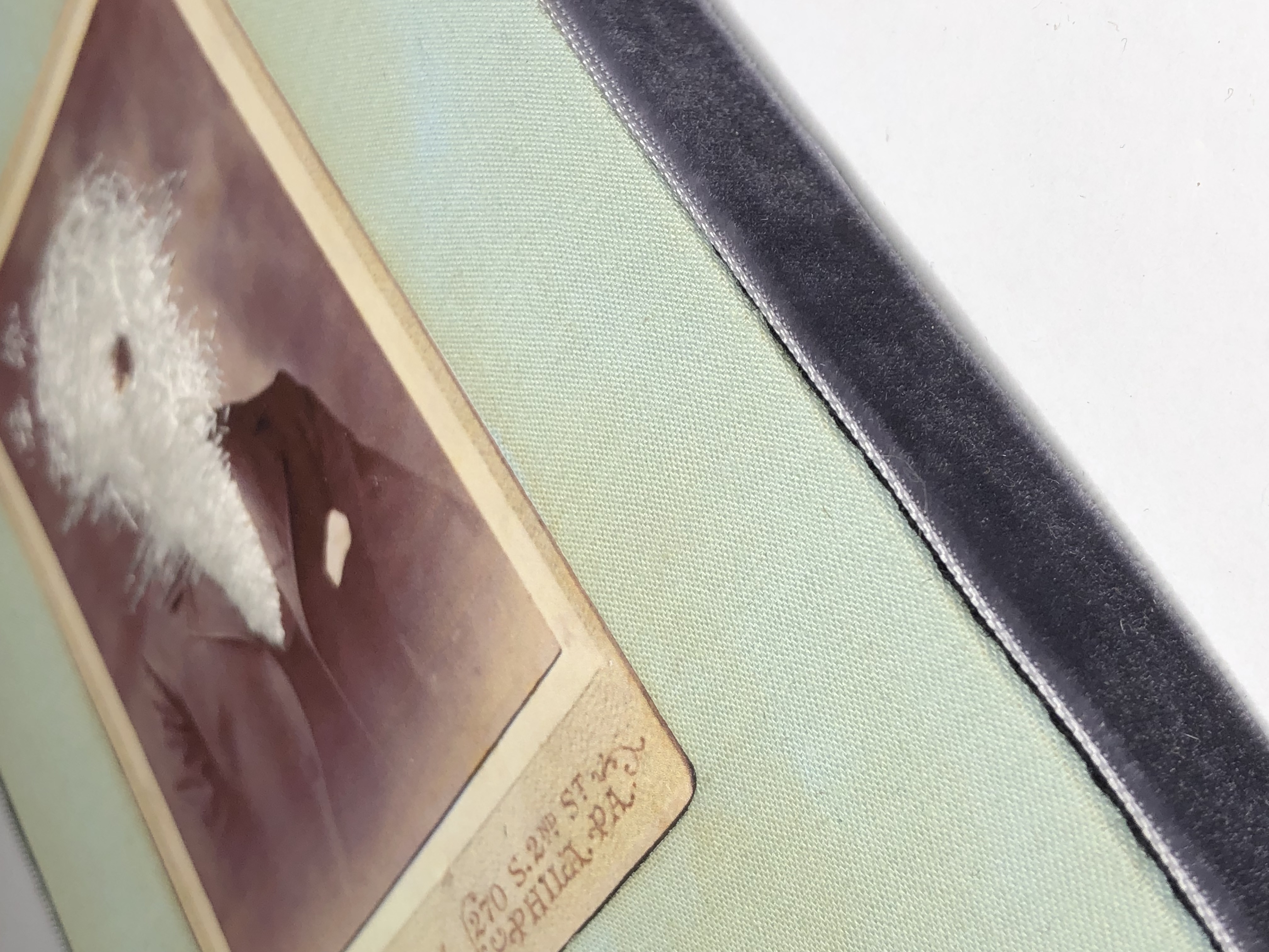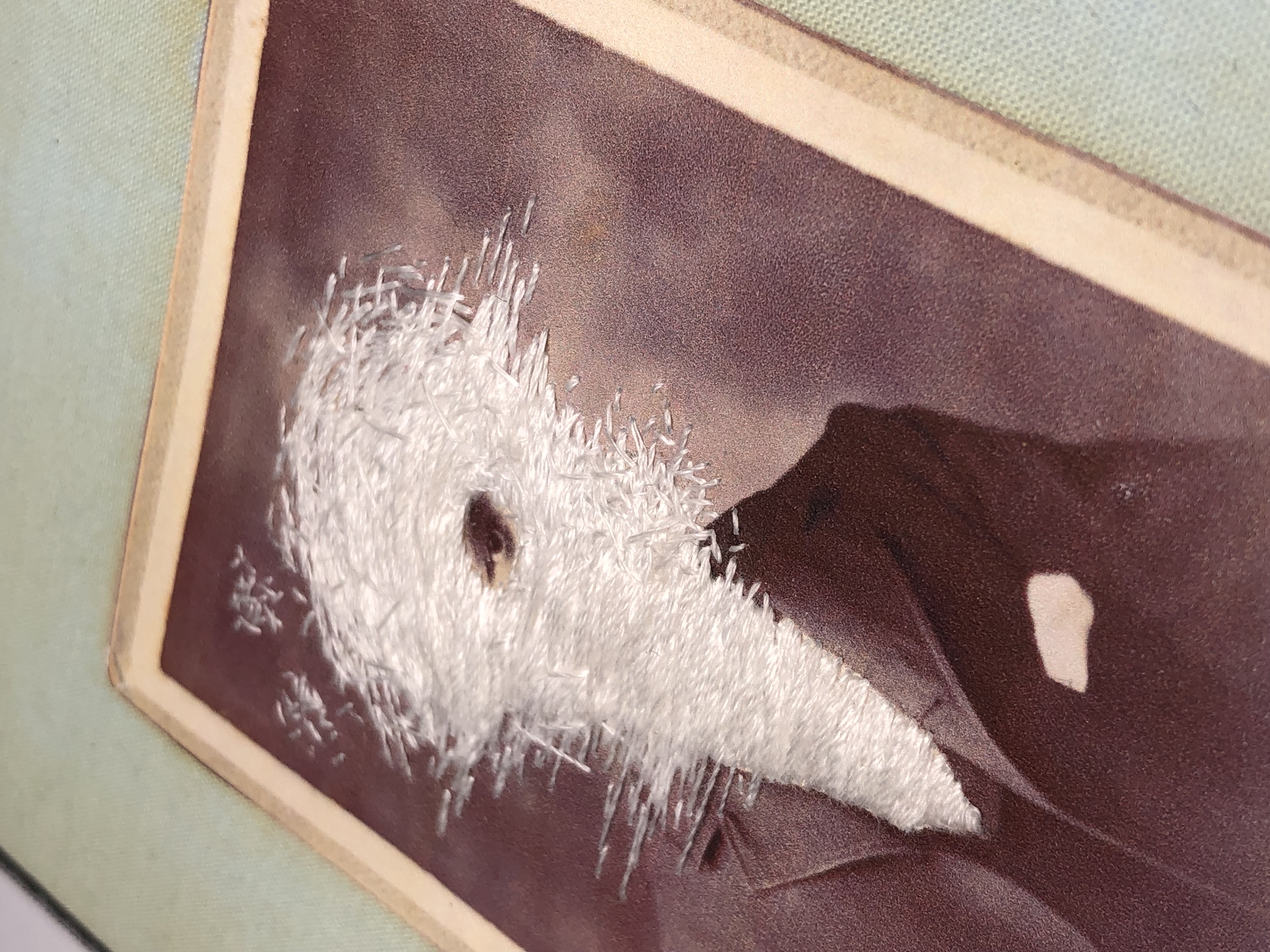 Hand embroidery and photo transfer on cotton. Mounted on board and trimmed with velvet ribbon. Signed and dated with picture hanger on back.