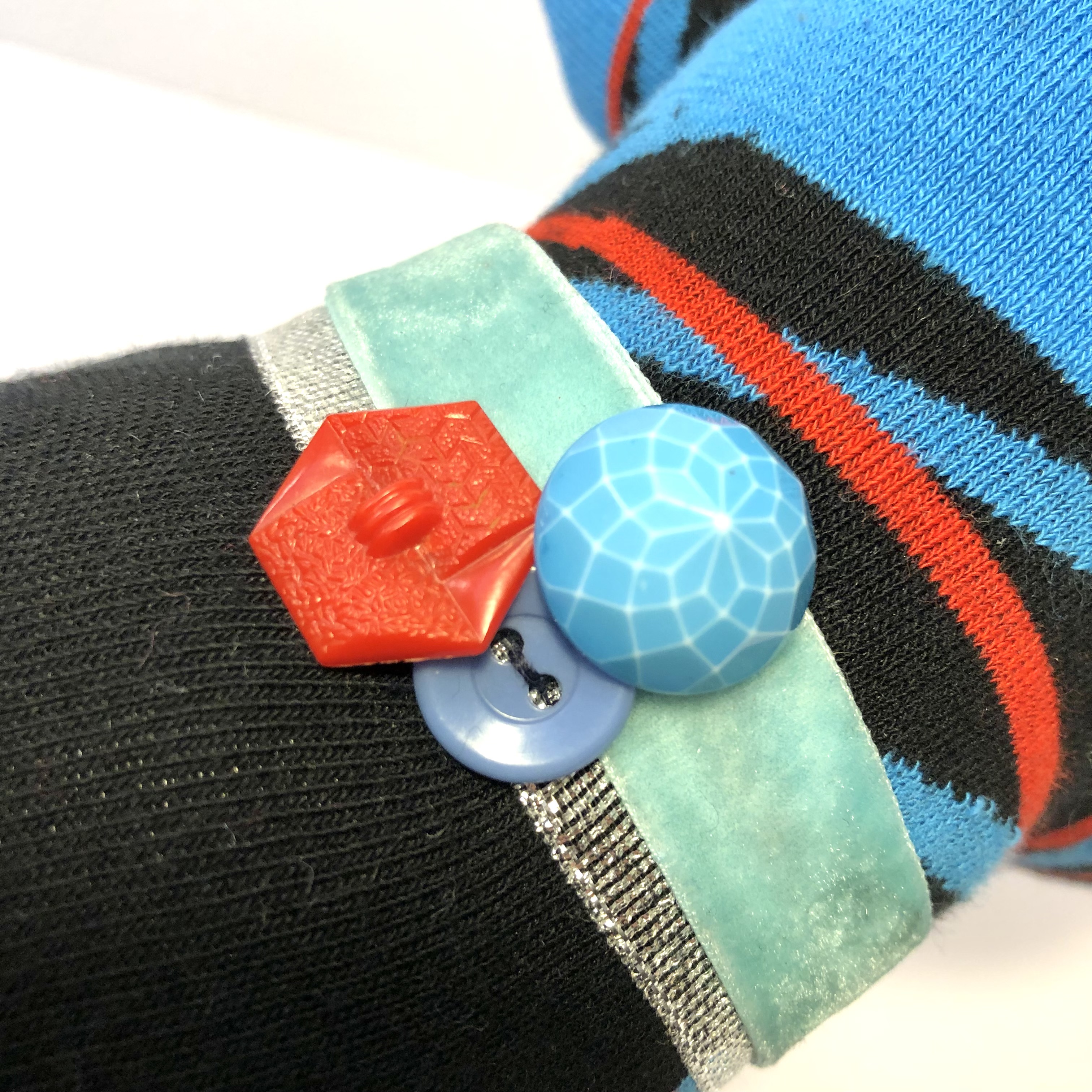 The collars are made from various trims and ribbons, and adorned with vintage and antique buttons and beads from my little collection. Please note that the vintage and antique pieces used may show slight signs of scuffing or discoloration due to age. Lots of fun stuff on these guys- rhinestones, flapper beads, even Bakelite and depression glass buttons!