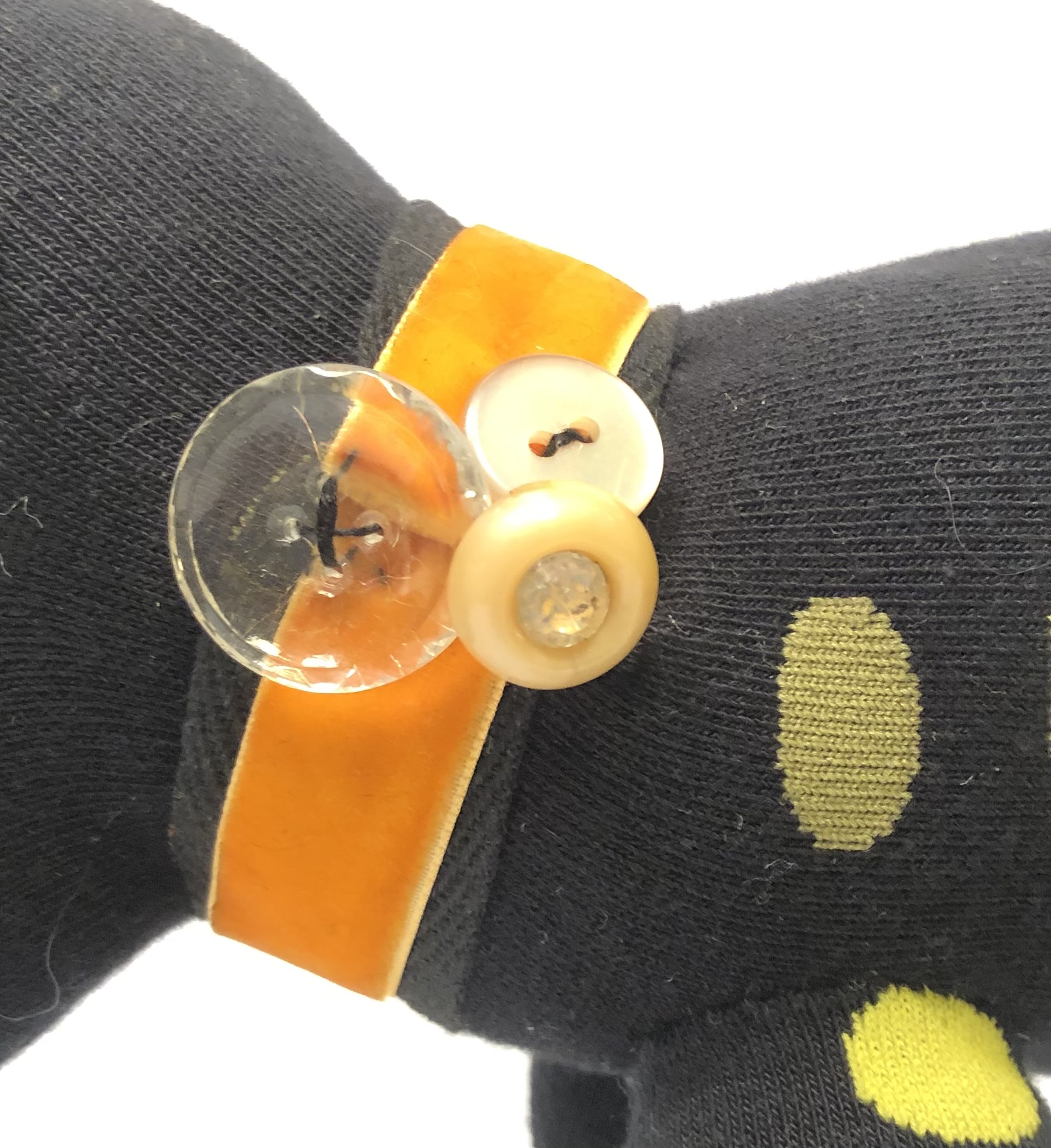 The collars are made from various trims and ribbons, and adorned with vintage and antique buttons and beads from my little collection. Please note that the vintage and antique pieces used may show slight signs of scuffing or discoloration due to age. Lots of fun stuff on these guys- rhinestones, flapper beads, even Bakelite and depression glass buttons!
