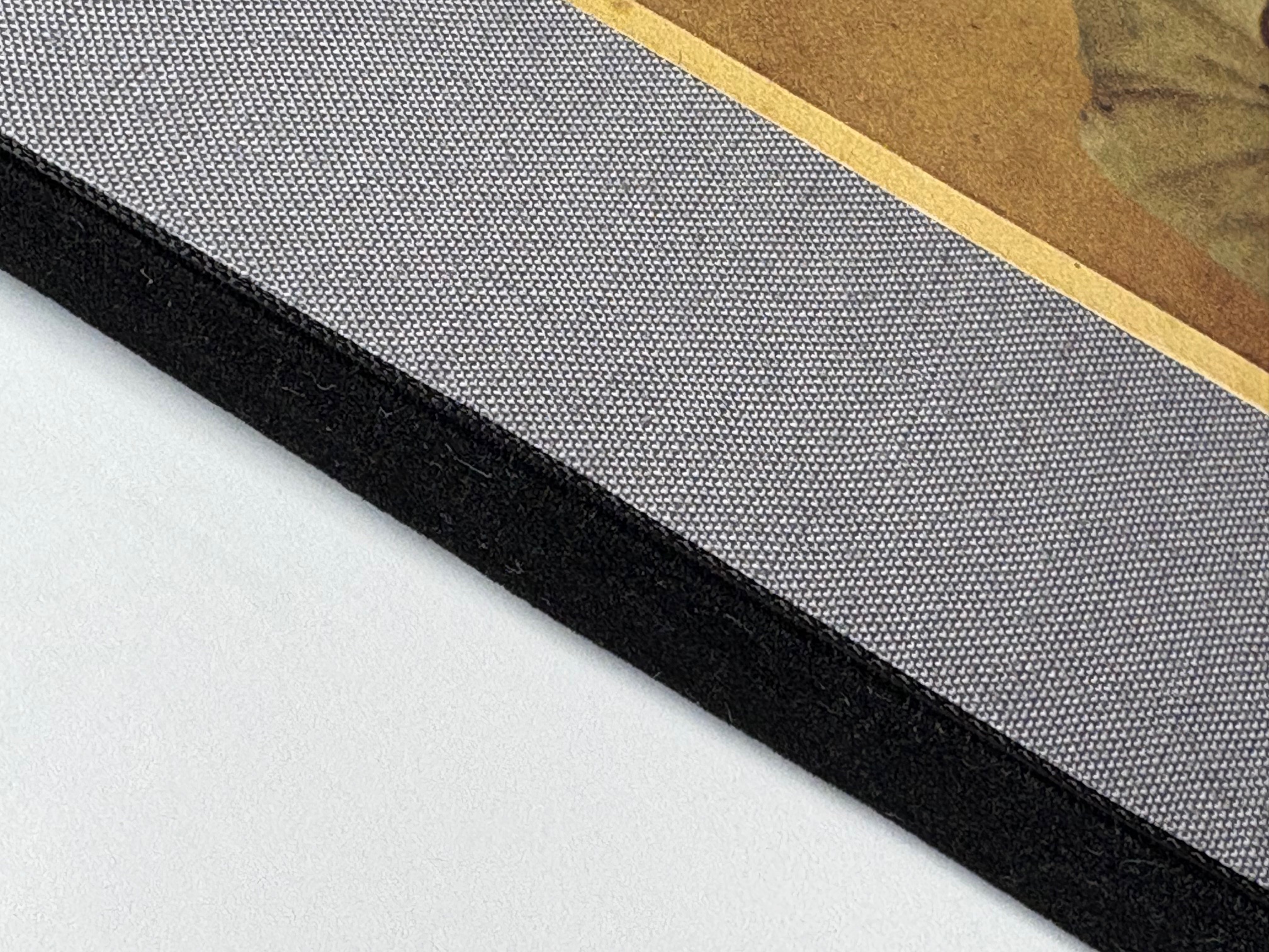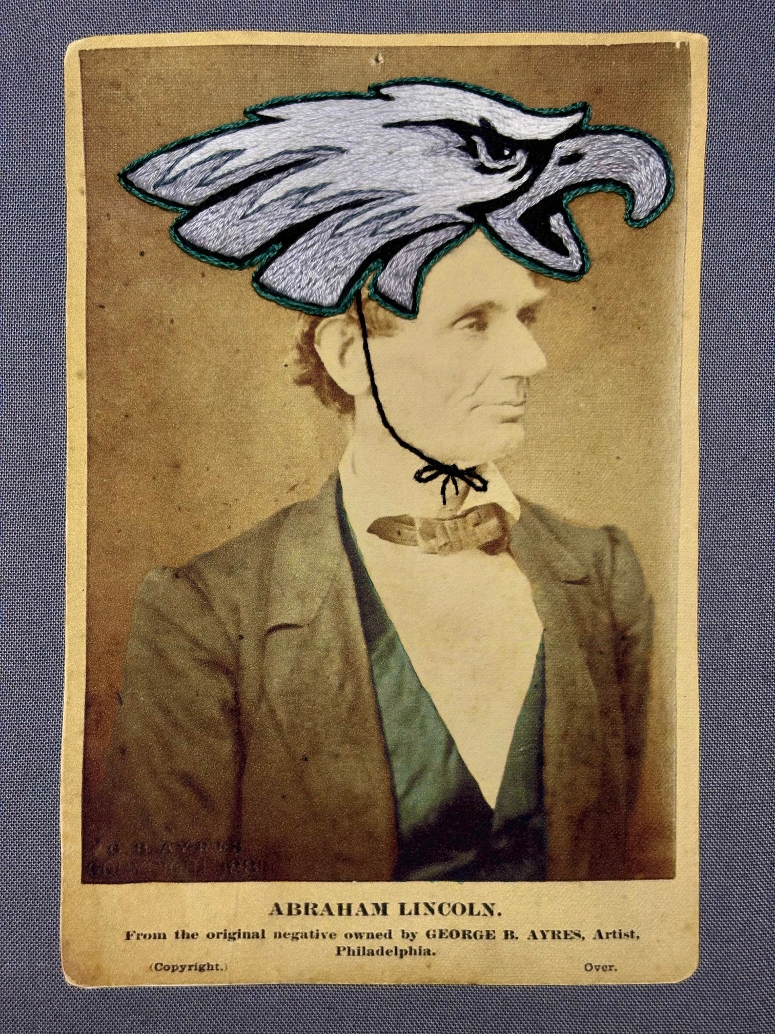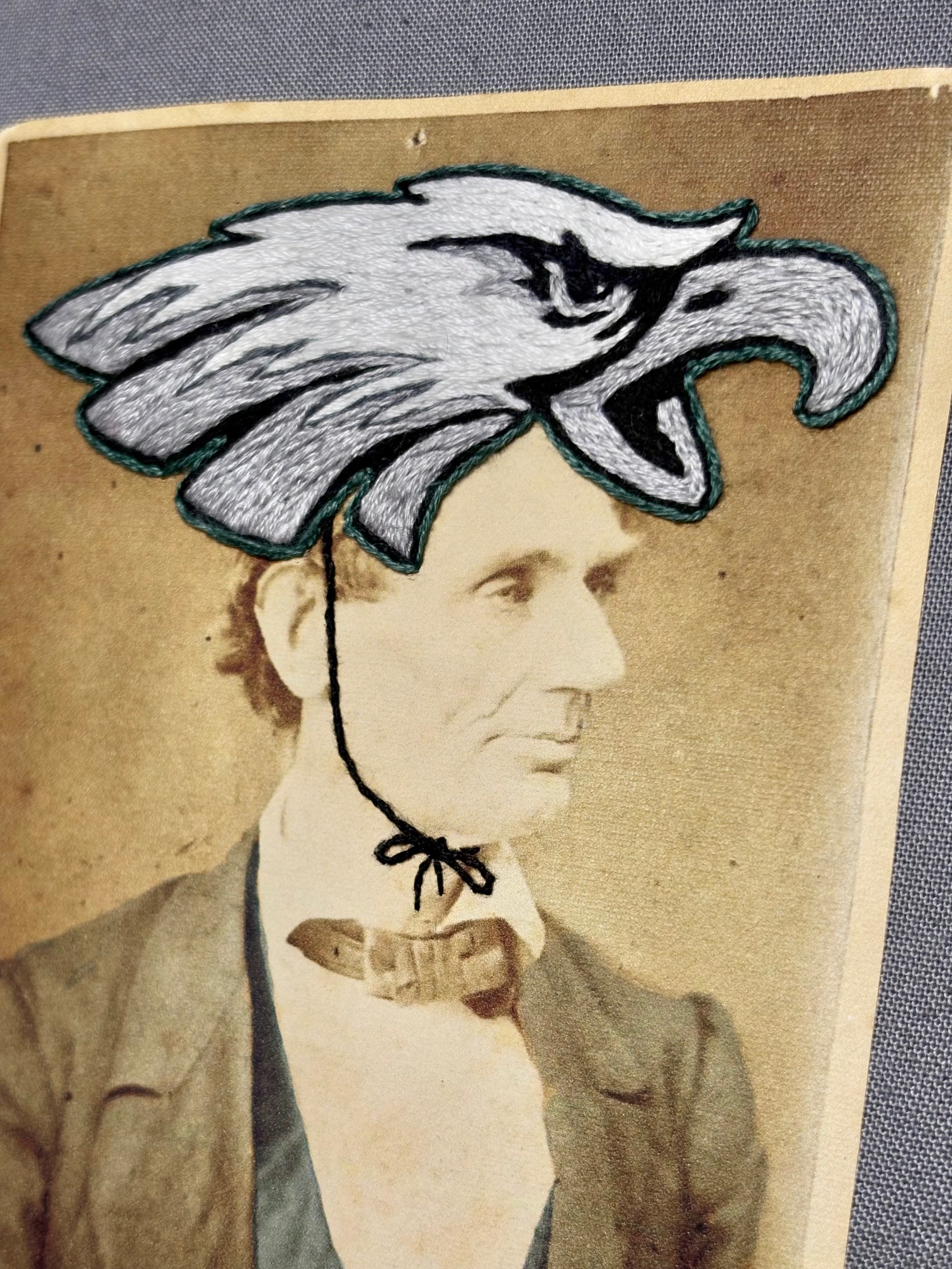 Hand embroidery and photo transfer on cotton. Mounted on board and trimmed with velvet. Signed and dated with picture hanger attached.