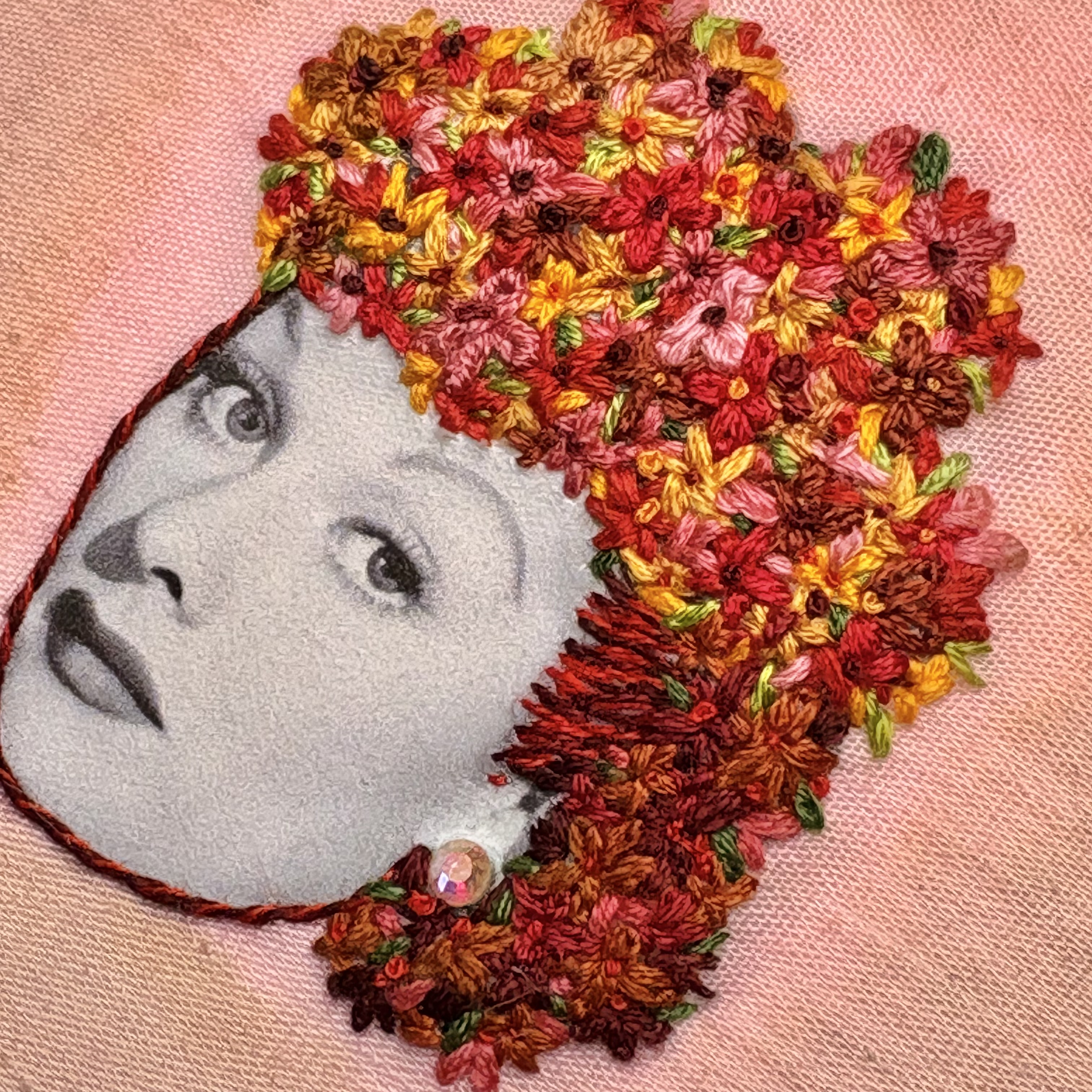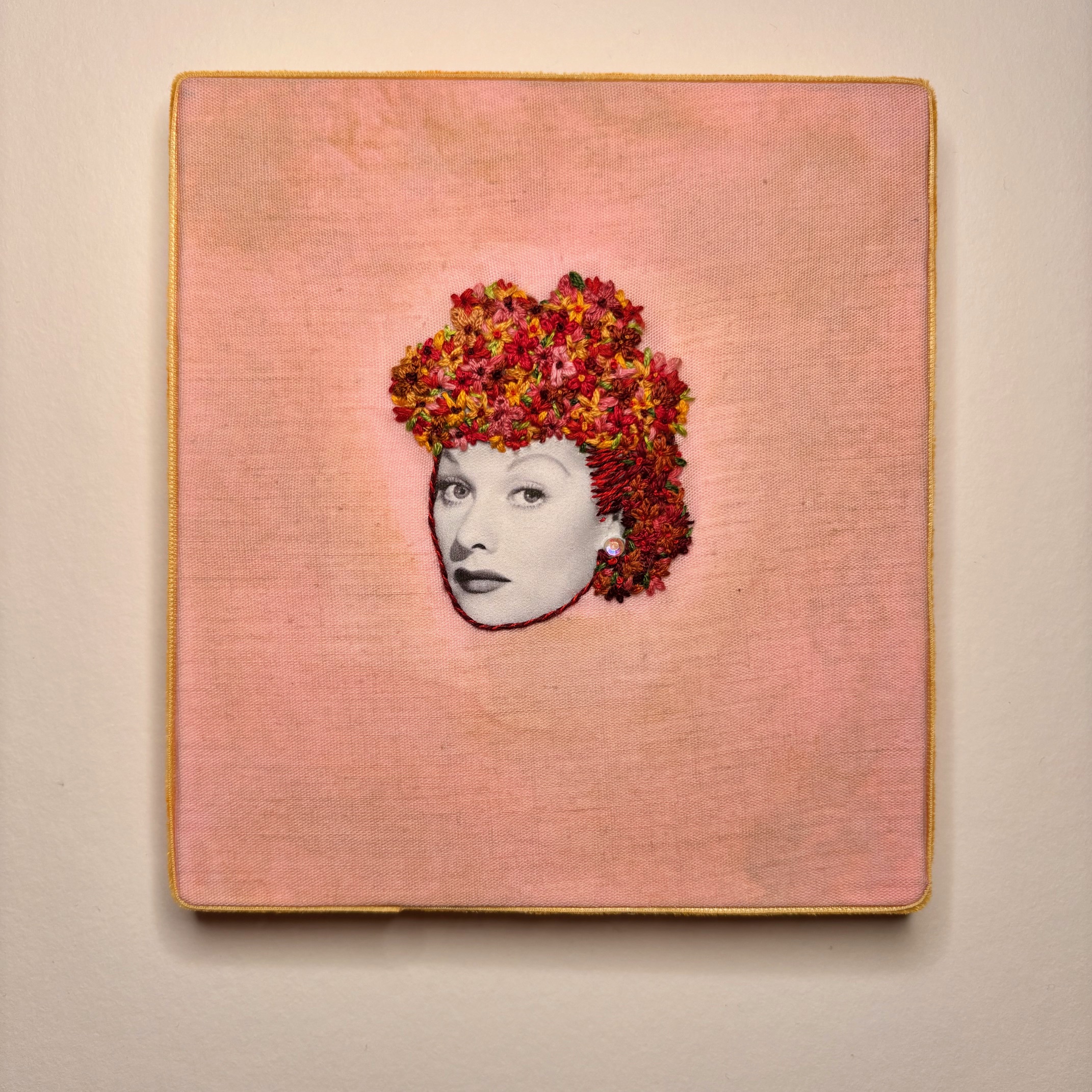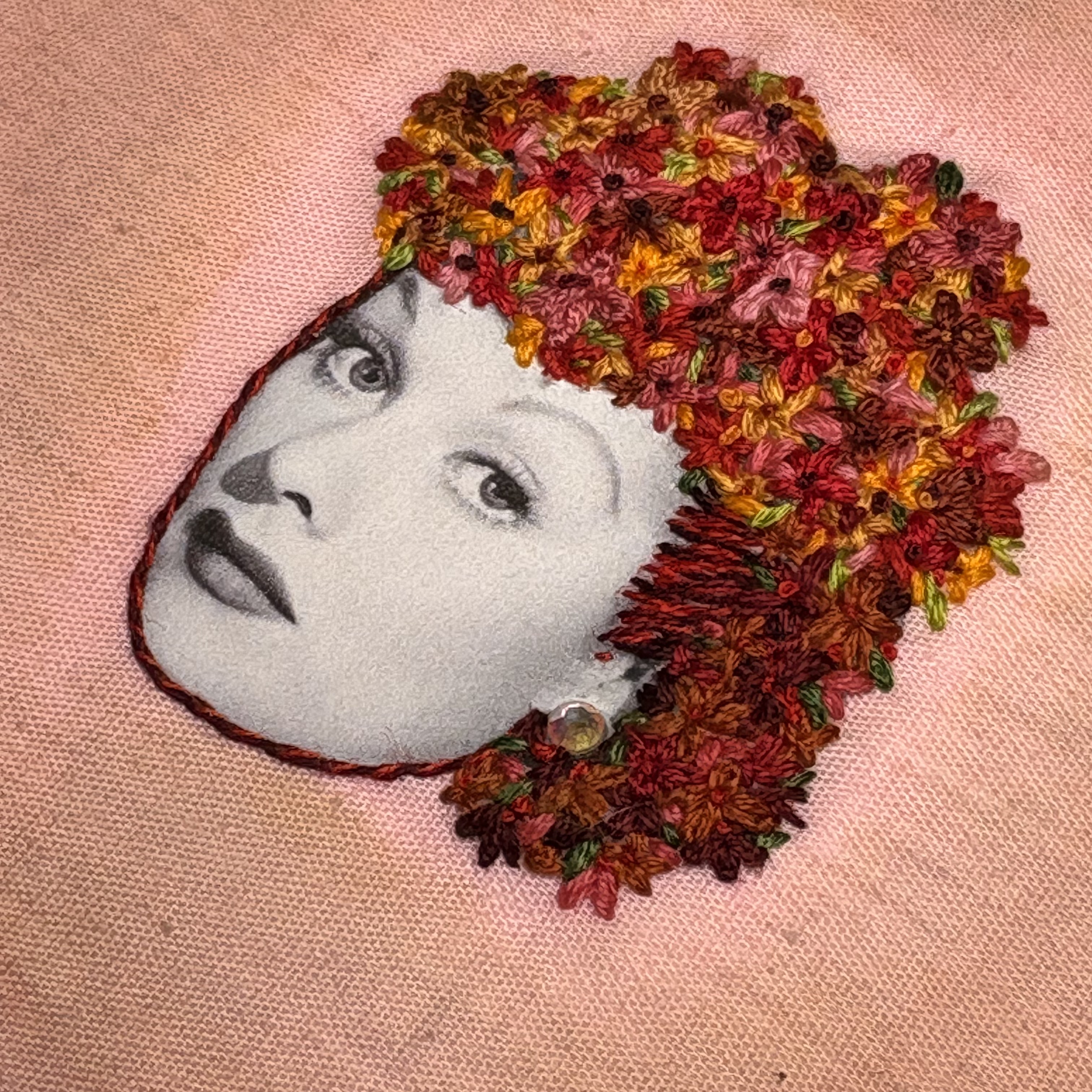 Hand embroidery and photo transfer, with acid dyes on cotton. Mounted on board and trimmed with velvet ribbon and accented with an AB rhinestone. Signed and dated with picture hanger on back.