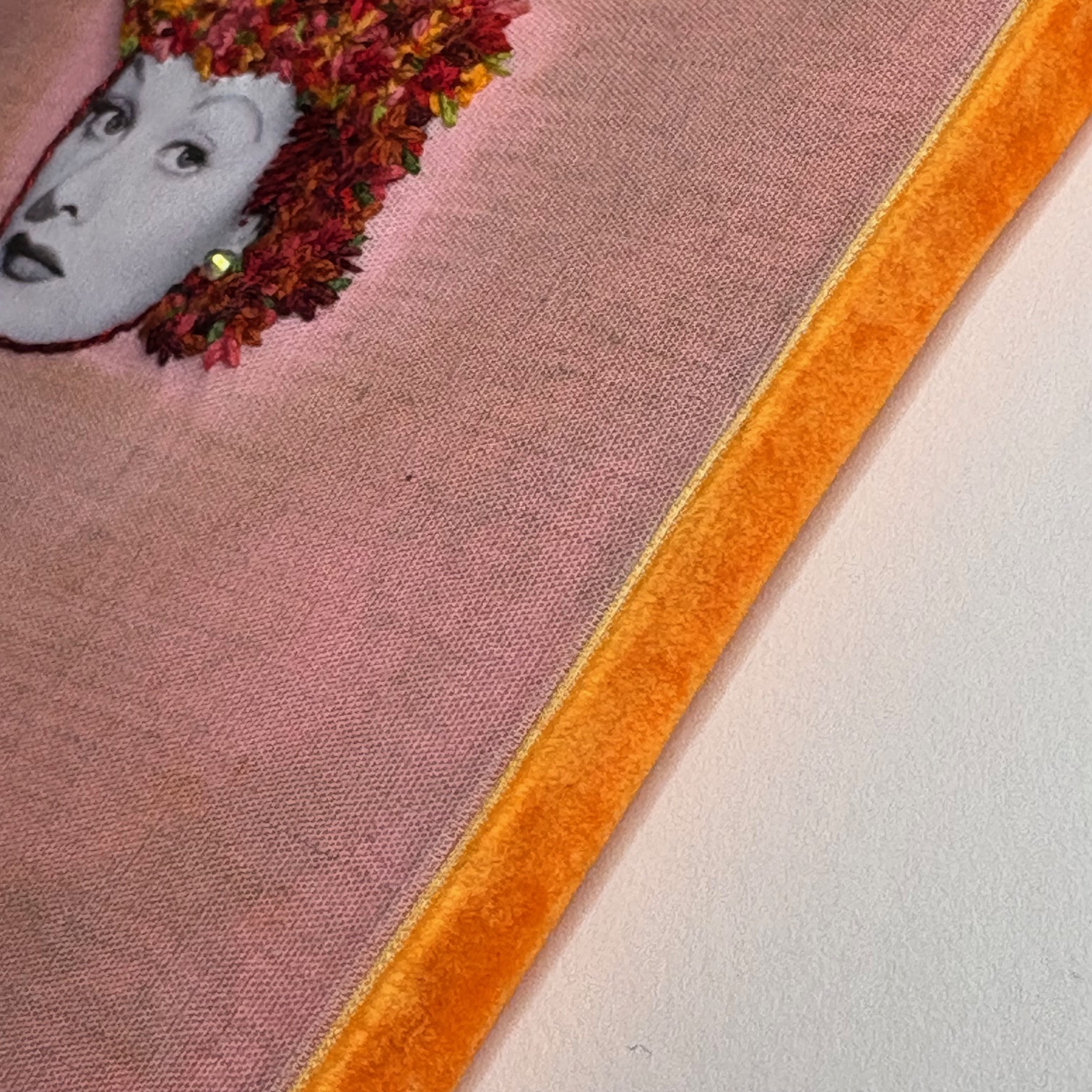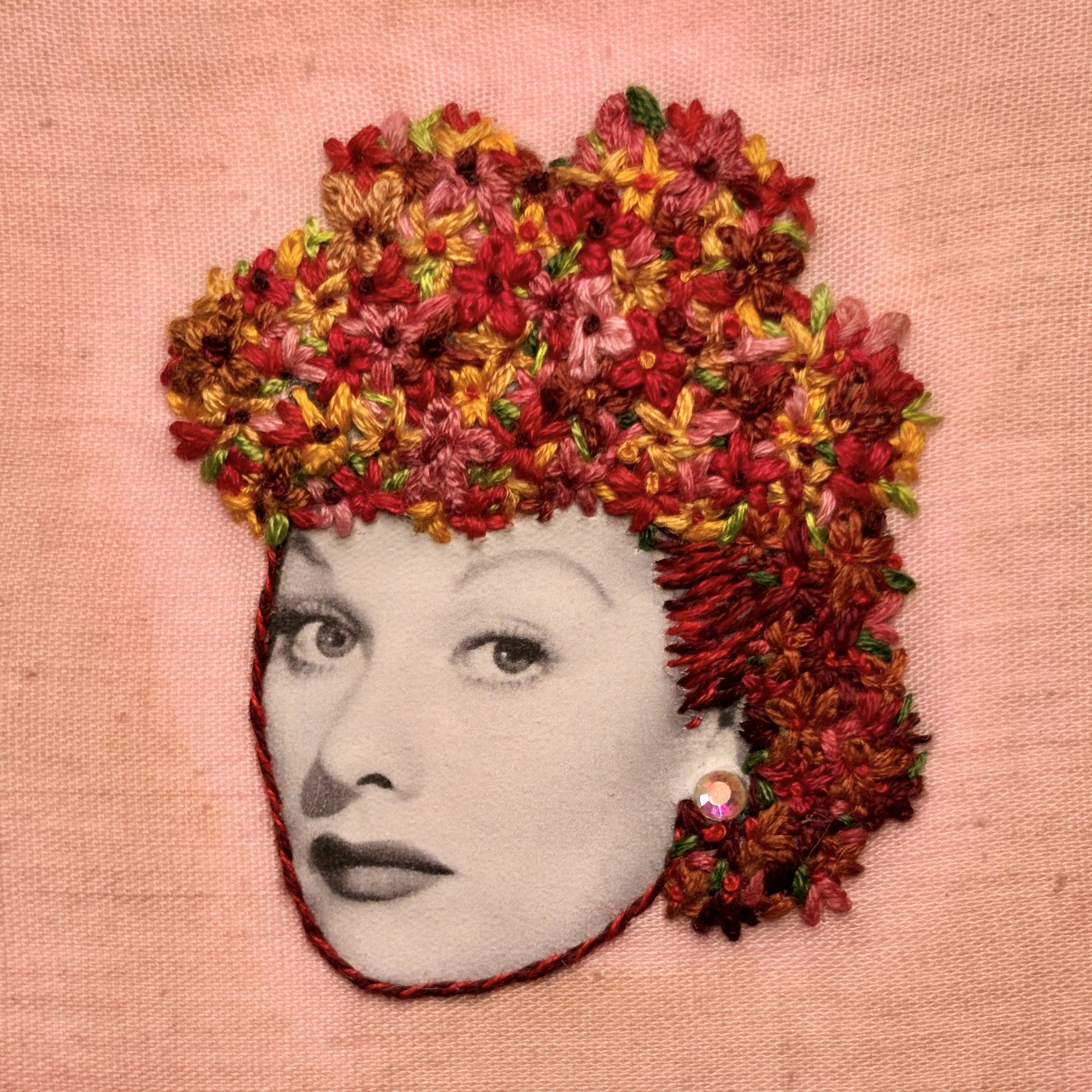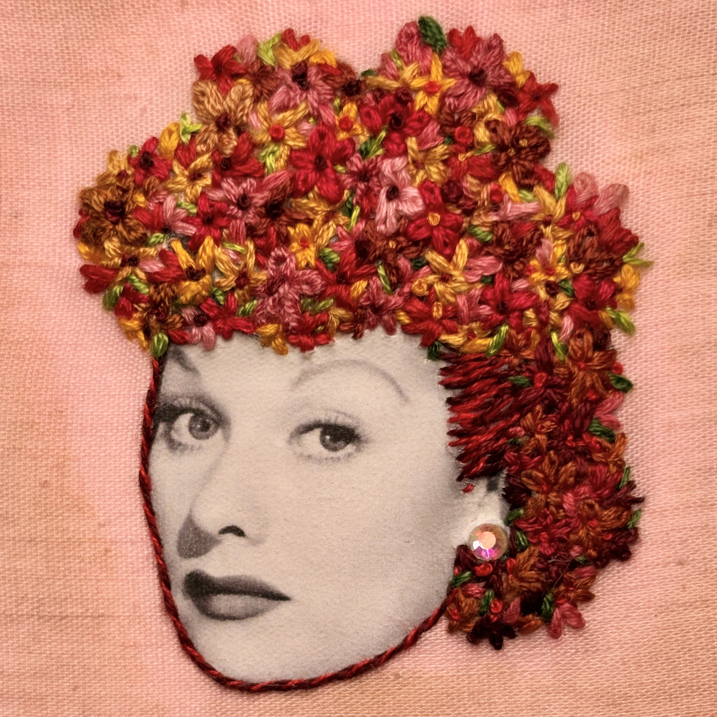 Hand embroidery and photo transfer, with acid dyes on cotton. Mounted on board and trimmed with velvet ribbon and accented with an AB rhinestone. Signed and dated with picture hanger on back.