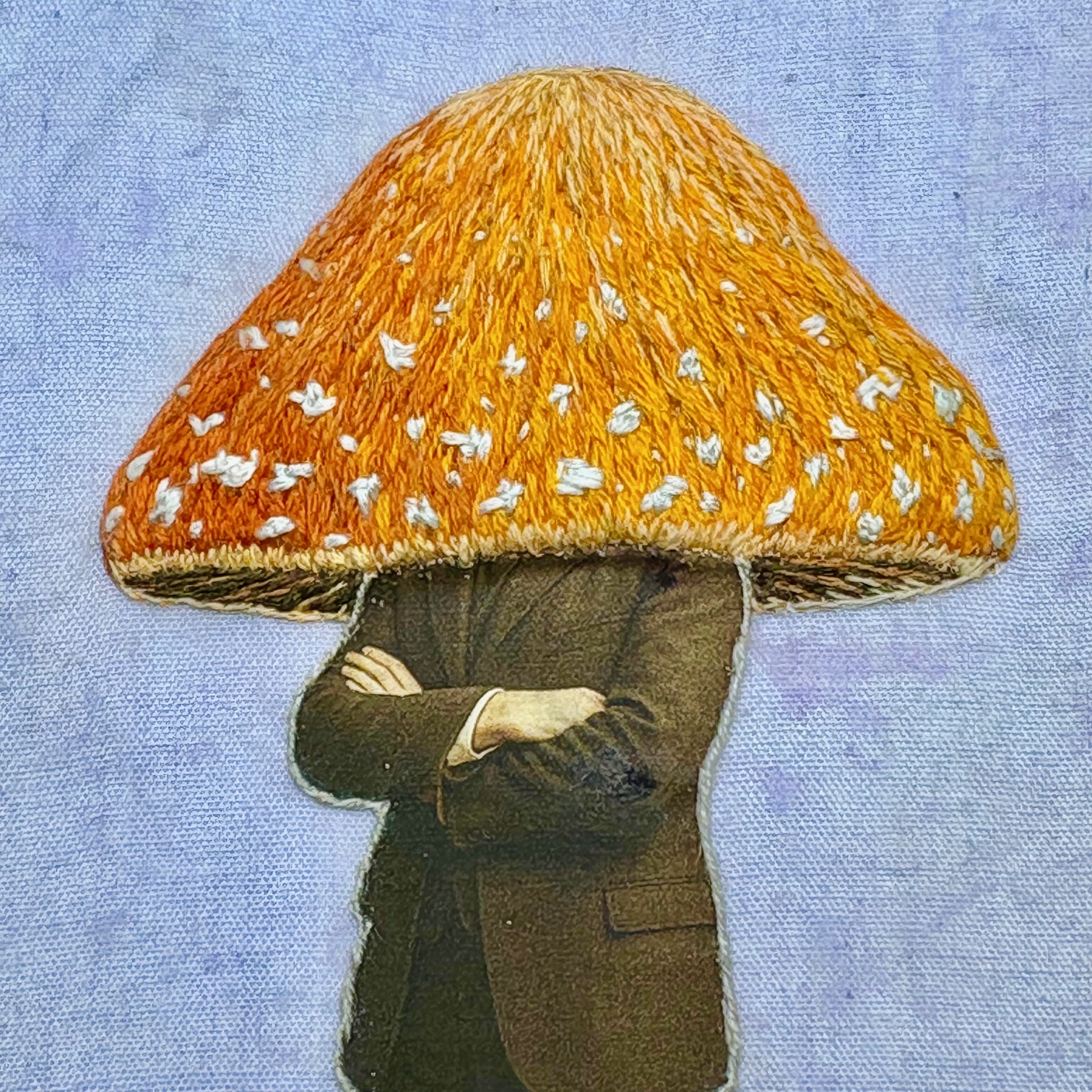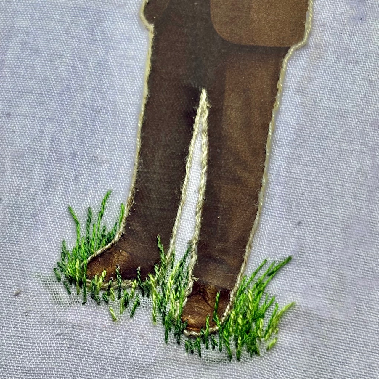 Hand embroidery, acid dyes, and photo transfer on cotton. Mounted on board and trimmed with velvet. Signed and dated with picture hanger on back.