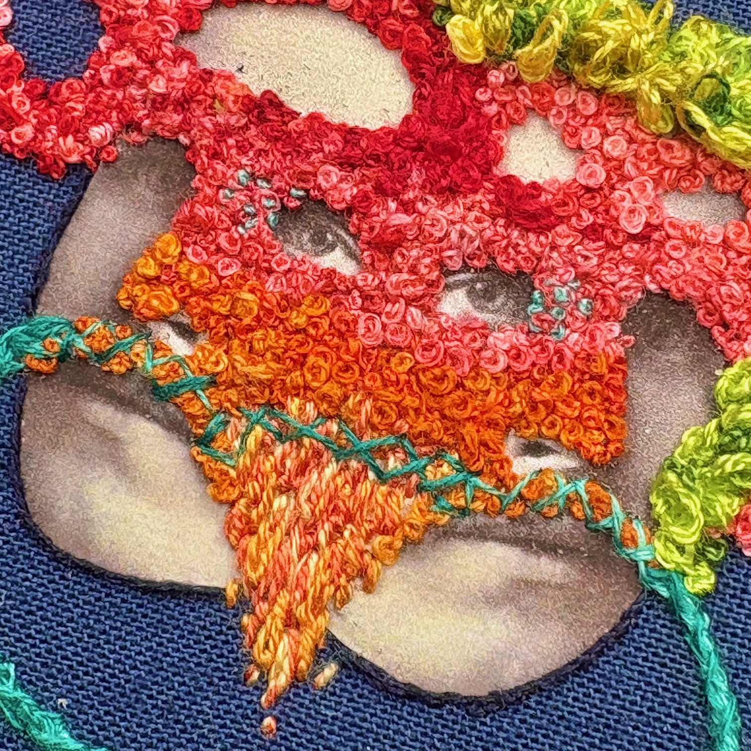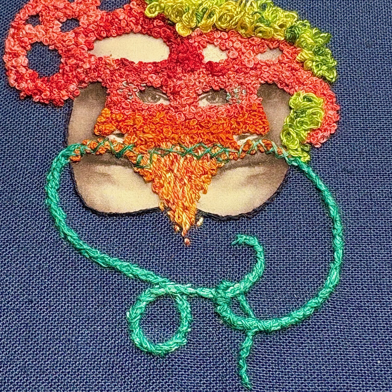 Hand embroidery and photo transfer on cotton. Mounted on board and trimmed with velvet. Signed and dated with picture hanger on back.