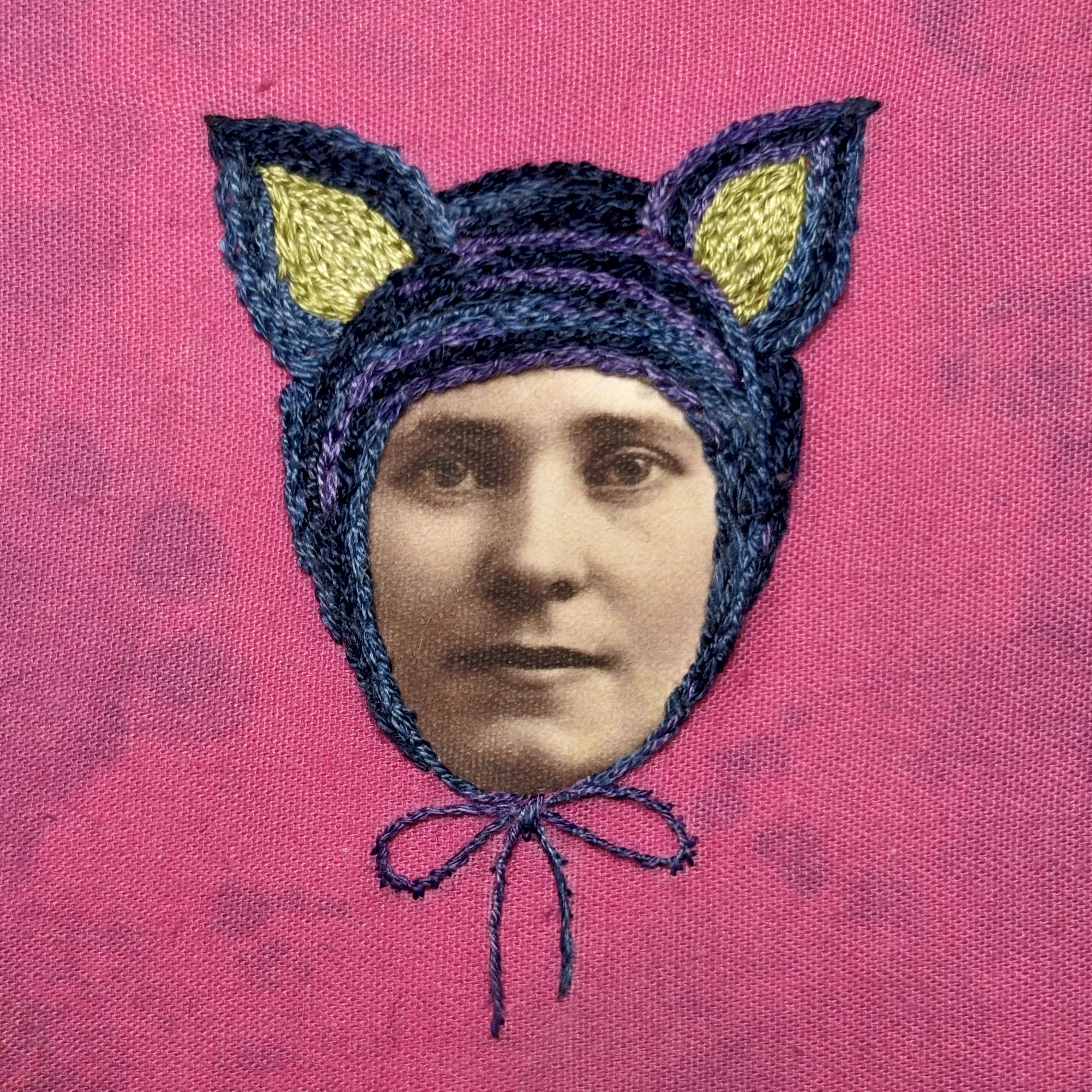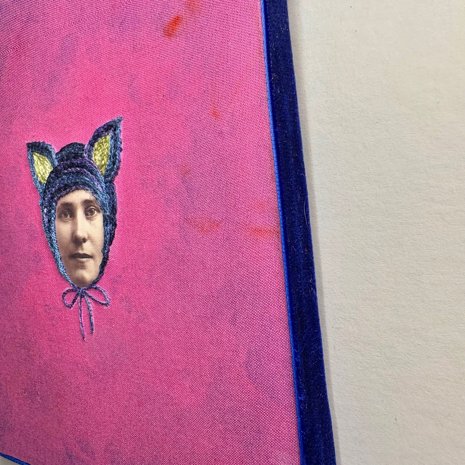 Hand embroidery, acid dyes, and photo transfer on cotton. Mounted on board and trimmed with velvet. Signed and dated with picture hanger on back. 5.25" x 6.25" .5" deep