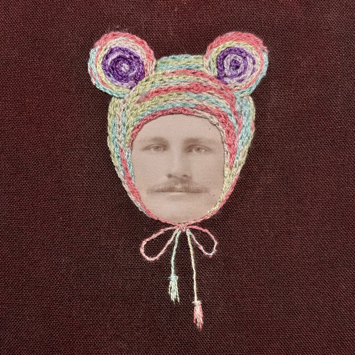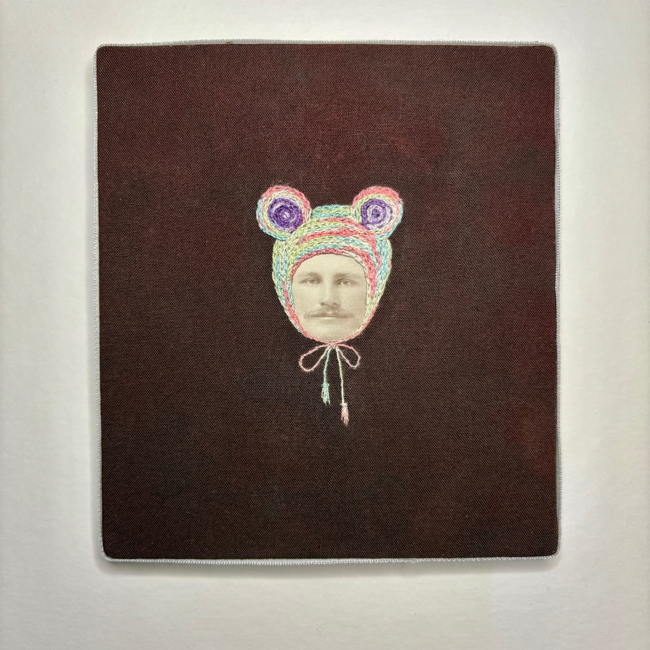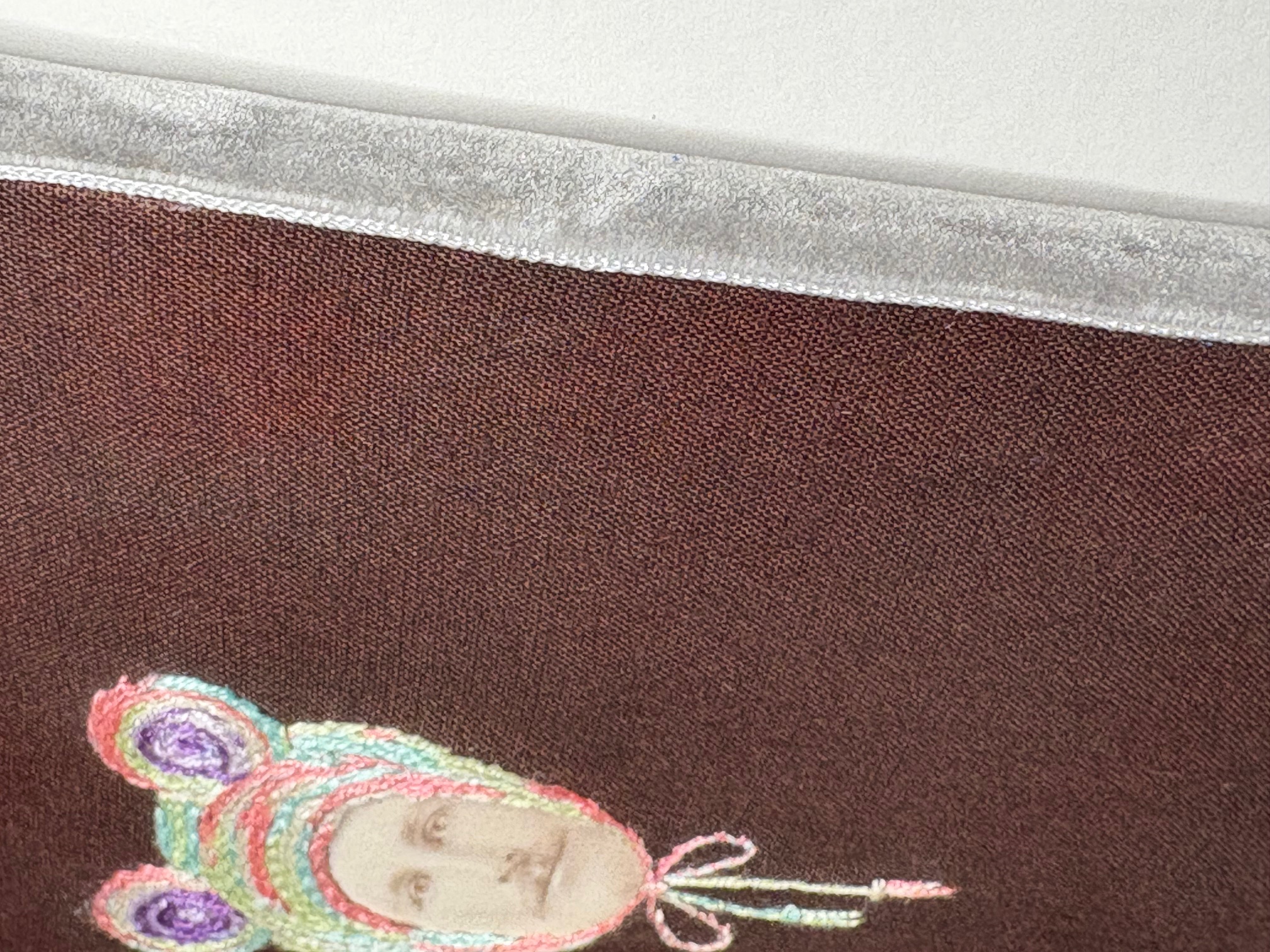 Hand embroidery, acid dyes, and photo transfer on cotton. Mounted on board and trimmed with velvet. Signed and dated with picture hanger on back. 5.25" x 6.25" .5" deep